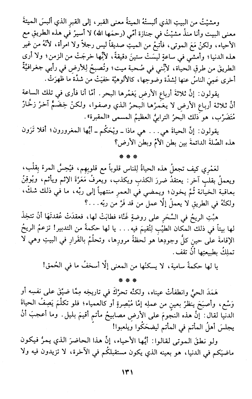 ومشيت من البيت الذي ألبسته الميتة معنى القبر، إلى القبر الذي ألبس الميتة معنى البيت وأنا منذ مشيت في جنازة أمي "رحمها الله" لا أسير في هذه الطريق مع الأحياء، ولكن مع الموتى، فأتبع من الميت صديقا ليس رجلا ولا امرأة، لأنه من غير هذه الدنيا؛ وأمشي في ساعة ليست ستين دقيقة، لأنها خرجت من الزمن؛ ولا أرى الطريق من طرق الحياة، لأنني في صحبة ميت؛ وتصبح للأرض في رأيي جغرافية أخرى عمي الناس عنها لشدة وضوحها، كالألوهية خفيت من شدة ما ظهرت.