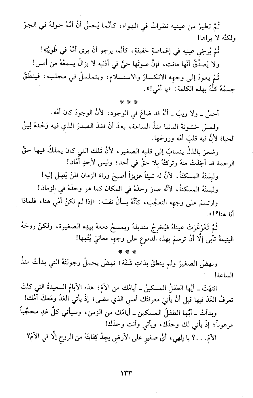 ثم تطير من عينيه نظرات في الهواء، كأنما يحس أن أمه حوله في الجو ولكنه لا يراها!