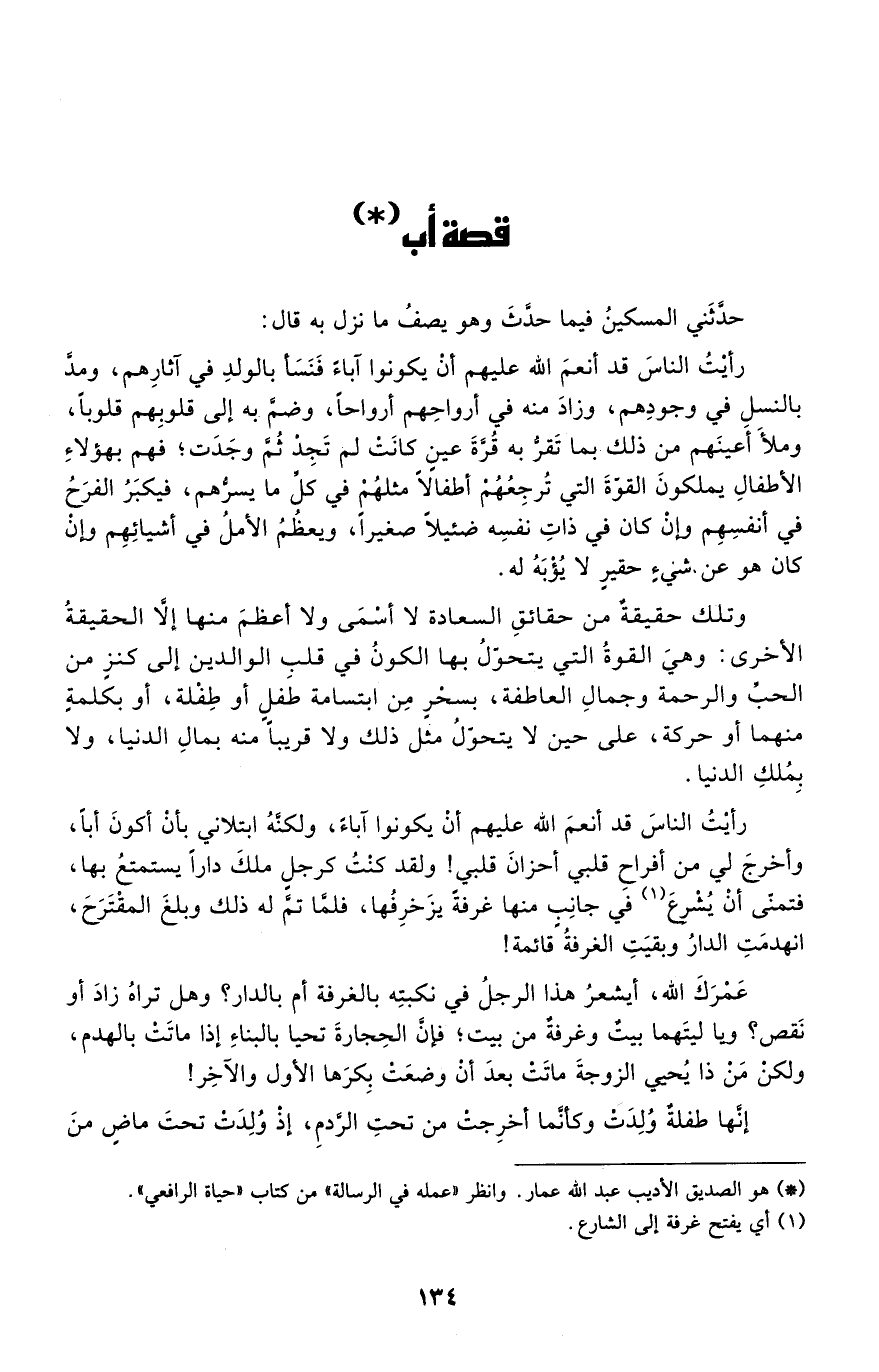 رأيت الناس قد أنعم الله عليهم أن يكونوا آباء فنسأ بالولد في آثارهم. ومد بالنسل في وجودهم، وزاد منه في أرواحهم أرواحًا، وضم به إلى قلوبهم قلوبا، وملأ أعينهم من ذلك بما تقر به قرة عين كانت لم تجد ثم وجدت، فهم بهؤلاء الأطفال يملكون القوة التي ترجعهم أطفالا مثلهم في كل ما يسرهم، فيكبر الفرح في أنفسهم وإن كان في ذات نفسه ضئيلا صغيرًا، ويعظم الأمل في أشيائهم وإن كان هو عن شيء حقير لا يؤبه له.