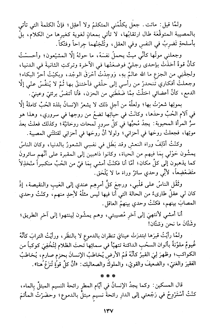 ولما قيل: ماتت. جعل يكلمني المتكلم ولا أعقل؛ فإن الكلمة التي تأتي بالمصيبة المتوقعة طال ارتقابها، لا تأتي بمعان لغوية كغيرها من الكلام، بل بأسلحة تضرب في النفس وفي العقل، وتثخنهما جراحا وفتكا.