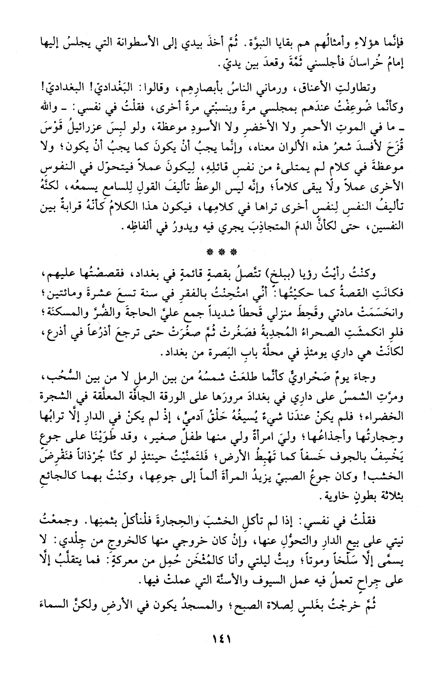 وتطاولت الأعناق، ورماني الناس بأبصارهم، وقالوا: البغدادي! البغدادي! وكأنما ضوعفت عندهم بمجلسي مرة وبنسبتي مرة أخرى, فقلت في نفسي: والله ما في الموت الأحمر والأخضر ولا الأسود موعظة، ولو لبس عزرائيل قوس قزح لأفسد شعر هذه الألوان معناه، وإنما يجب أن يكون كما يجب أن يكون؛ ولا موعظة في كلام لم يمتلئ من نفس قائله، ليكون عملا فيتحول في النفوس الأخرى عملا ولا يبقى كلاما؛ وإنه ليس الوعظ تأليف القول للسامع يسمعه، لكنه تأليف النفس لنفس أخرى تراها في كلامها، فيكون هذا الكلام كأنه قرابة بين النفسين، حتى كأن الدم المتجاذب يجري فيه ويدور في ألفاظه.