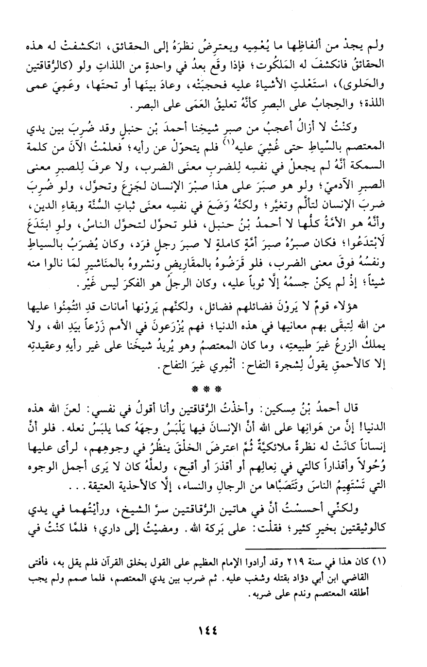 1 كان هذا في سنة 219 وقد أرادوا الإمام العظيم على القول بخلق القرآن فلم يقل به، فأفتى القاضي ابن أبي دؤاد بقتله وشغب عليه. ثم ضرب بين يدي المعتصم، فلما صمم ولم يجب أطلقه المعتصم وندم على ضربه.