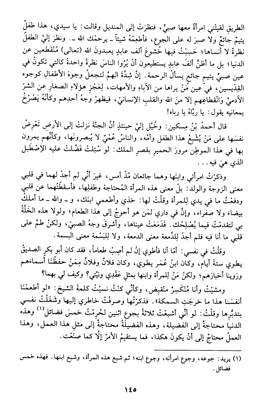 وذكرت امرأتي وابنها وهما جائعان مذ أمس، غير أني لم أجد لهما في قلبي معنى الزوجة والولد, بل معنى هذه المرأة المحتاجة وطفلها، فأسقطتهما عن قلبي ودفعت ما في يدي للمرأة وقلت لها: خذي وأطعمي ابنك، ووالله ما أملك بيضاء ولا صفراء، وإن في داري لمن هو أحوج إلى هذا الطعام؛ ولولا هذه الخلة بي لتقدمت فيما يصلحك، فدمعت عيناها، وأشرق وجه الصبي، ولكن طم على قلبي ما أنا فيه فلم أجد للدمعة معنى الدمعة، ولا للبسمة معنى البسمة.