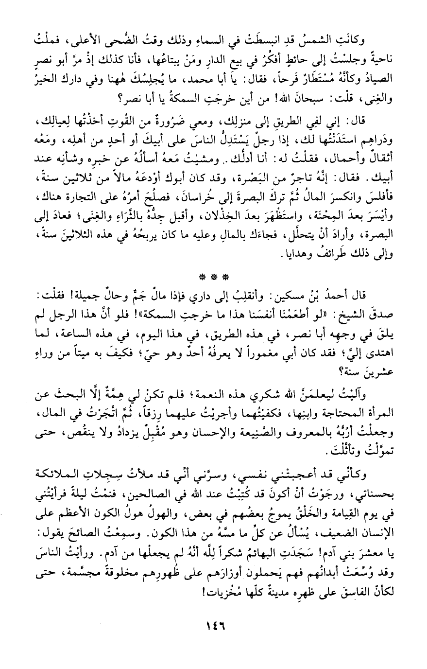 قال أحمد بن مسكين: وأنقلب إلى داري فإذا مال جم وحال جميلة! فقلت: صدق الشيخ: "لو أطعمنا أنفسنا هذا ما خرجت السمكة"! فلو أن هذا الرجل لم يلق في وجهه أبا نصر، في هذه الطريق، في هذا اليوم، في هذه الساعة، لما اهتدى إلي؛ فقد كان أبي مغمورًا لا يعرفه أحد وهو حي؛ فكيف به ميتا من وراء عشرين سنة؟