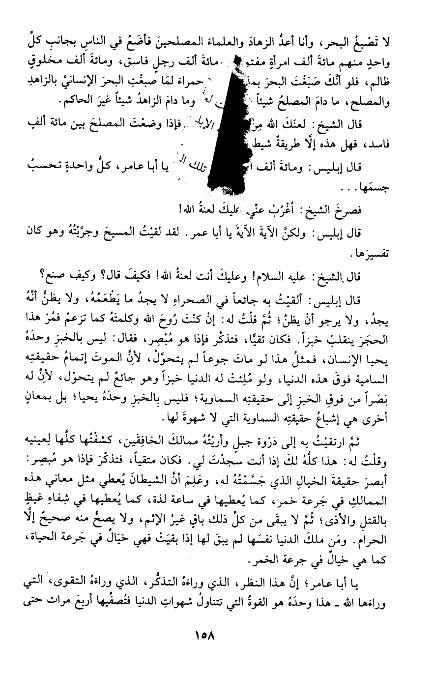 لا تصبغ البحر، وأنا أعد الزهاد والعلماء المصلحين فأضع في الناس بجانب كل واحد منهم مائة ألف امرأة مفتونة، ومائة ألف رجل فاسق، ومائة ألف مخلوق ظالم، فلو أنك صبغت البحر بملء قارورة حمراء لما صبغت البحر الإنساني بالزاهد والمصلح، ما دام المصلح شيئا غير السيف، وما دام الزاهد شيئا غير الحاكم.