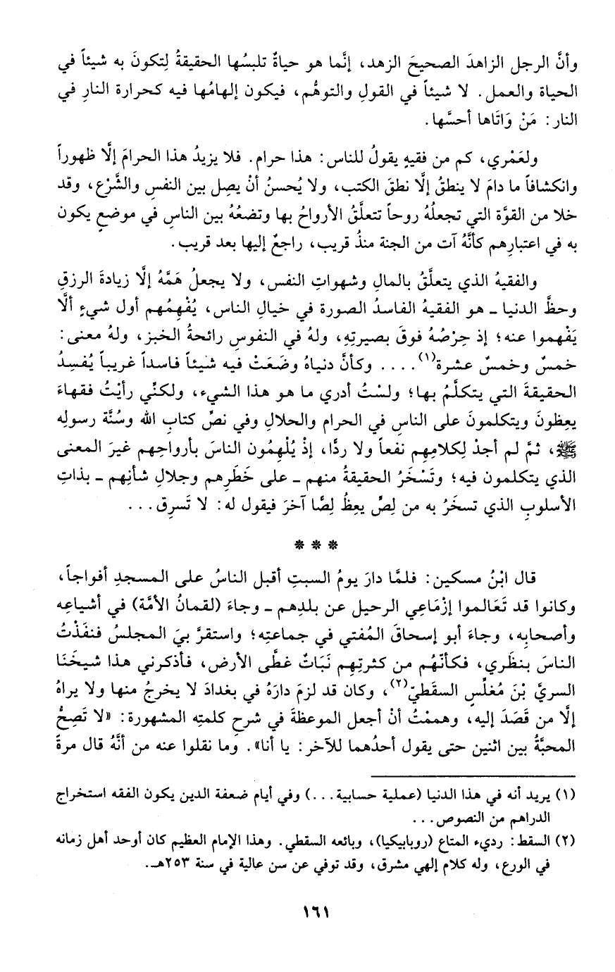 2 السقط: رديء المتاع "روبابيكيا"، وبائعه السقطي. وهذا الإمام العظيم كان أوحد أهل زمانه في الورع، وله كلام إلهي مشرق، وقد توفي عن سن عالية في سنة 253هـ.