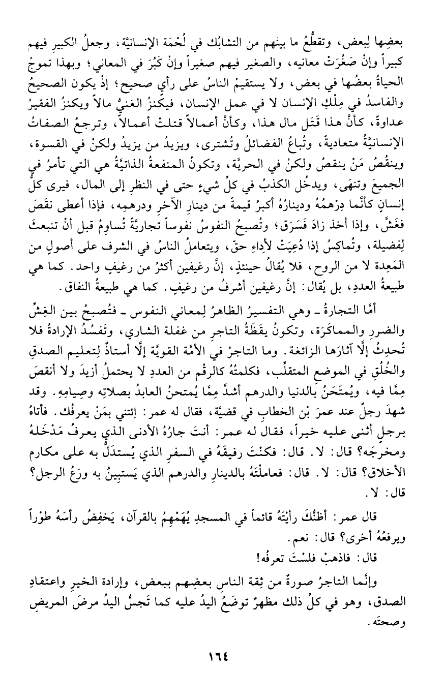 أما التجارة -وهي التفسير الظاهر لمعاني النفوس- فتصبح بين الغش والضرر والمماكرة، وتكون يقظة التاجر من غفلة الشاري، وتفسد الإرادة فلا تحدث إلا آثارها الزائغة. وما التاجر في الأمة القوية إلا أستاذ لتعليم الصدق والخلق في الموضع المتقلب، فكلمته كالرقم من العدد لا يحتمل أزيد ولا أنقص مما فيه، ويمتحن بالدنيا والدرهم أشد مما يمتحن العابد بصلاته وصيامه، وقد شهد رجل عند عمر بن الخطاب في قضية، فقال له عمر: ائتني بمن يعرفك. فأتاه برجل أثنى عليه خيرًا، فقال له عمر: أنت جاره الأدنى الذي يعرف مدخله ومخرجه؟ قال: لا. قال: فكنت رفيقه في السفر الذي يستدل به على مكارم الأخلاق؟ قال: لا. قال: فعاملته بالدينار والدرهم الذي يستبين به ورع الرجل؟ قال: لا.
