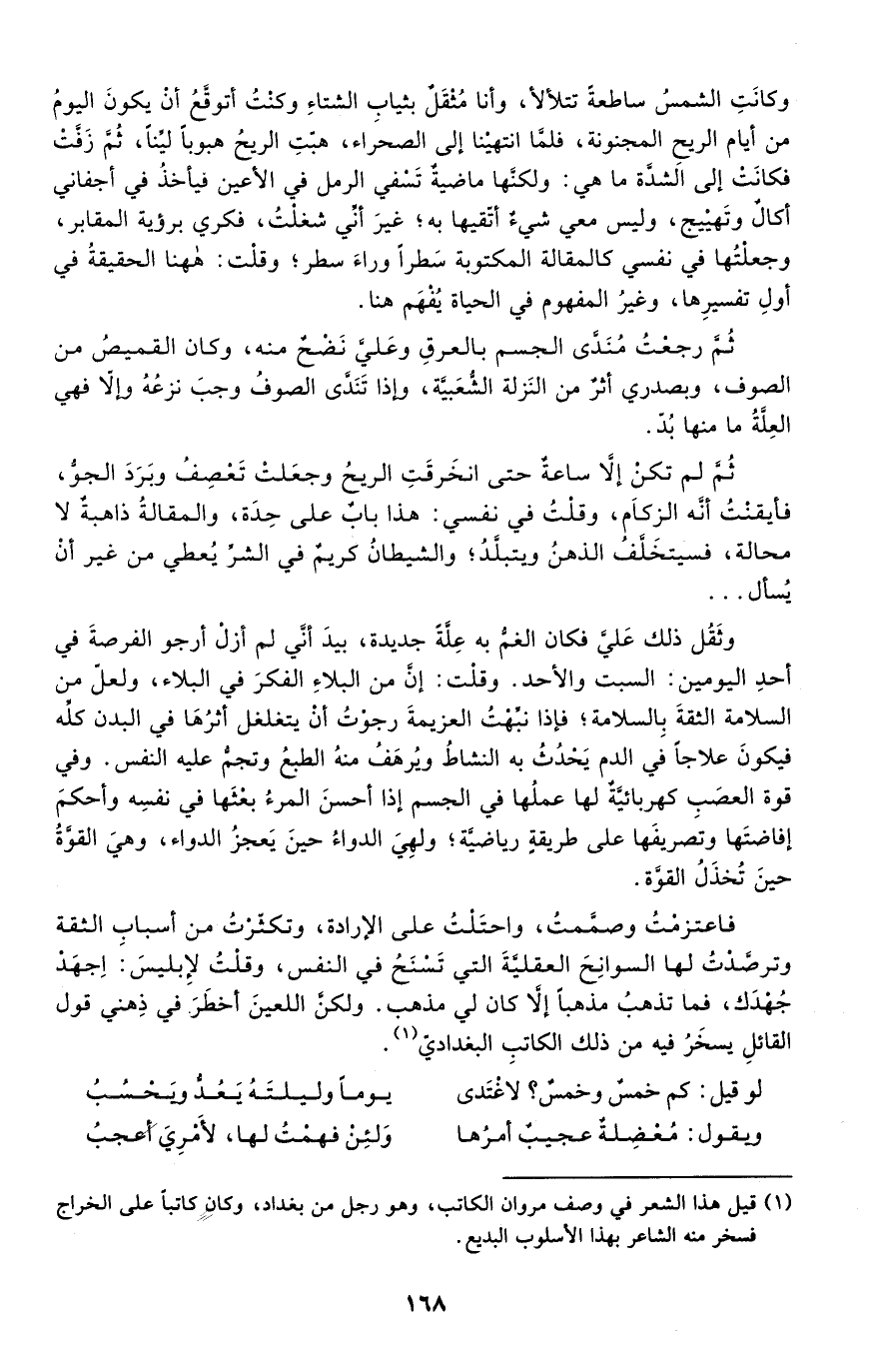 فاعتزمت وصممت، واحتلت على الإرادة، وتكثرت من أسباب الثقة وترصدت لها السوانح العقلية التي تسنح في النفس، وقلت لإبليس: اجهد جهدك، فما تذهب مذهبا إلا كان لي مذهب. ولكن اللعين أخطر في ذهني قول القائل يسخر فيه من ذلك الكاتب البغدادي1.