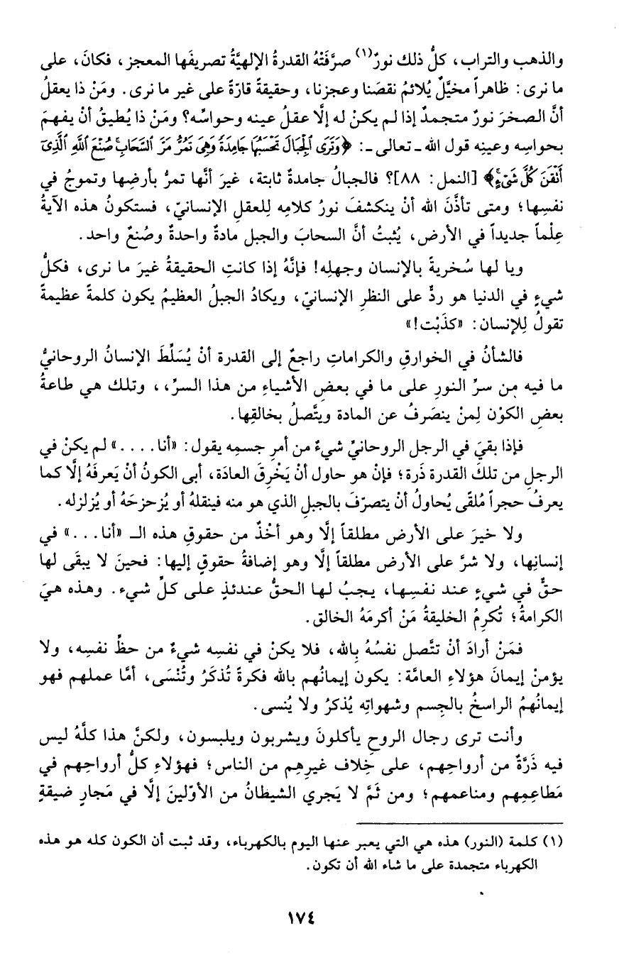 والذهب والتراب، كل ذلك نور1 صرفته القدرة الإلهية تصريفها المعجز، فكان، على ما نرى: ظاهرا مخيل يلائم نقصنا وعجزنا، وحقيقة قارة على غير ما نرى. ومن ذا يعقل أن الصخر نور متجمد إذا لم يكن له إلا عقل عينه وحواسه؟ ومن ذا يطيق أن يفهم بحواسه وعينه قول الله -تعالى-: {وَتَرَى الْجِبَالَ تَحْسَبُهَا جَامِدَةً وَهِيَ تَمُرُّ مَرَّ السَّحَابِ صُنْعَ اللَّهِ الَّذِي أَتْقَنَ كُلَّ شَيْءٍ} [النمل: 88] ؟ فالجبال جامدة ثابتة، غير أنها تمر بأرضها وتموج في نفسها؛ ومتى تأذن الله أن ينكشف نور كلامه للعقل الإنساني، فستكون هذه الآية علما جديدًا في الأرض، يثبت أن السحاب والجبل مادة واحدة وصنع واحد.