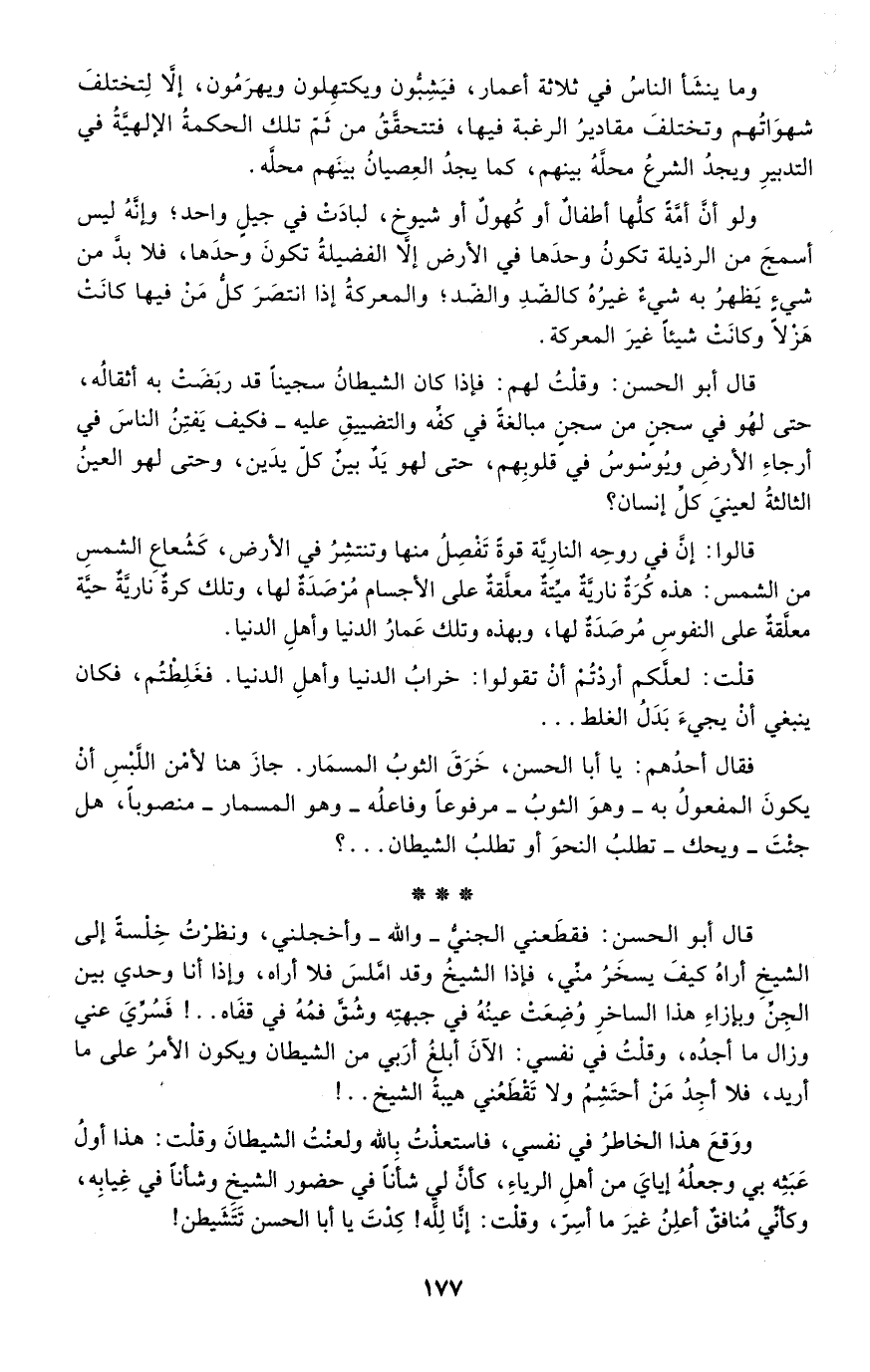 ووقع هذا الخاطر في نفسي، فاستعذت بالله ولعنت الشيطان وقلت: هذا أول عبثه بي وجعله إياي من أهل الرياء، كأن لي شأنا في حضور الشيخ وشأنا في غيابه، وكأني منافق أعلن غير ما أسر، وقلت: إنا لله! كدت يا أبا الحسن تتشيطن!