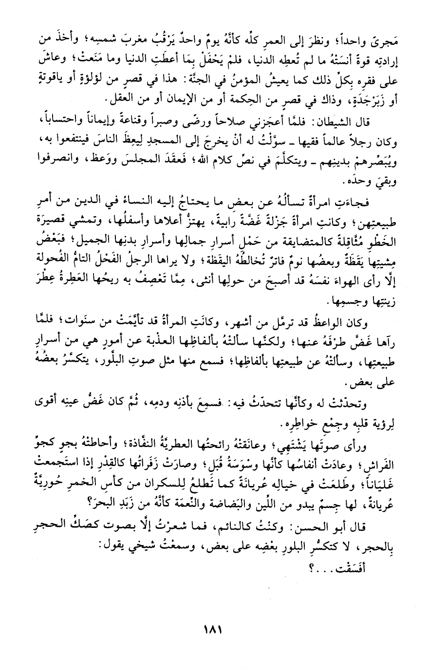 وكان الواعظ قد ترمل من أشهر، وكانت المرأة قد تأيمت من سنوات؛ فلما رآها غض طرفه عنها؛ ولكنها سألته بألفاظها العذبة عن أمور هي من أسرار طبيعتها، وسألته عن طبيعتها بألفاظها؛ فسمع منها مثل صوت البلور، يتكسر بعضه على بعض.