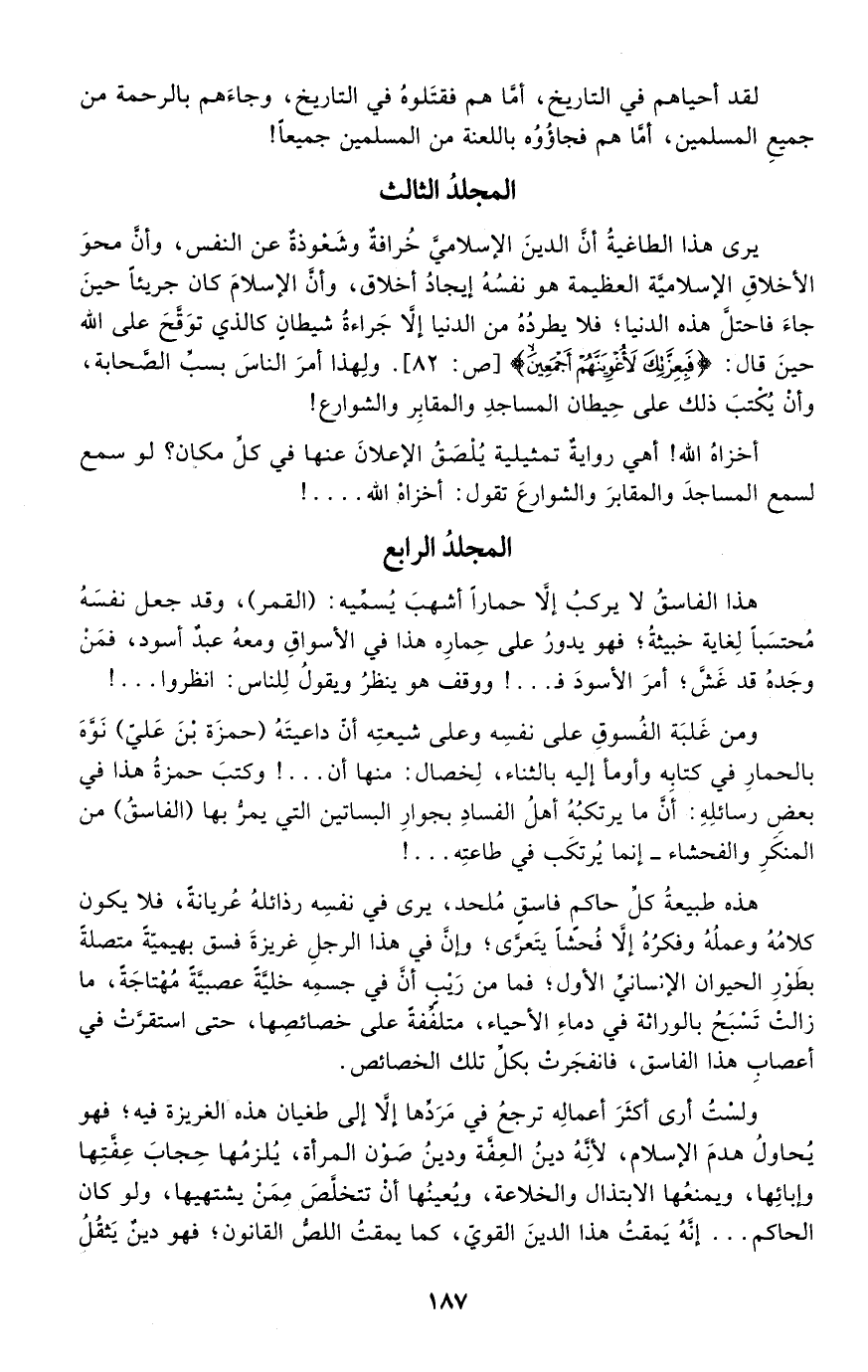 هذه طبيعة كل حاكم فاسق ملحد، يرى في نفسه رذائله عريانة، فلا يكون كلامه وعمله وفكره إلا فحشا يتعرى؛ وإن في هذا الرجل غريزة فسق بهيمية متصلة بطور الحيوان الإنساني الأول؛ فما من ريب أن في جسمه خلية عصبية مهتاجة، ما زالت تسبح بالوراثة في دماء الأحياء، متلففة على خصائصها، حتى استقرت في أعصاب هذا الفاسق، فانفجرت بكل تلك الخصائص.