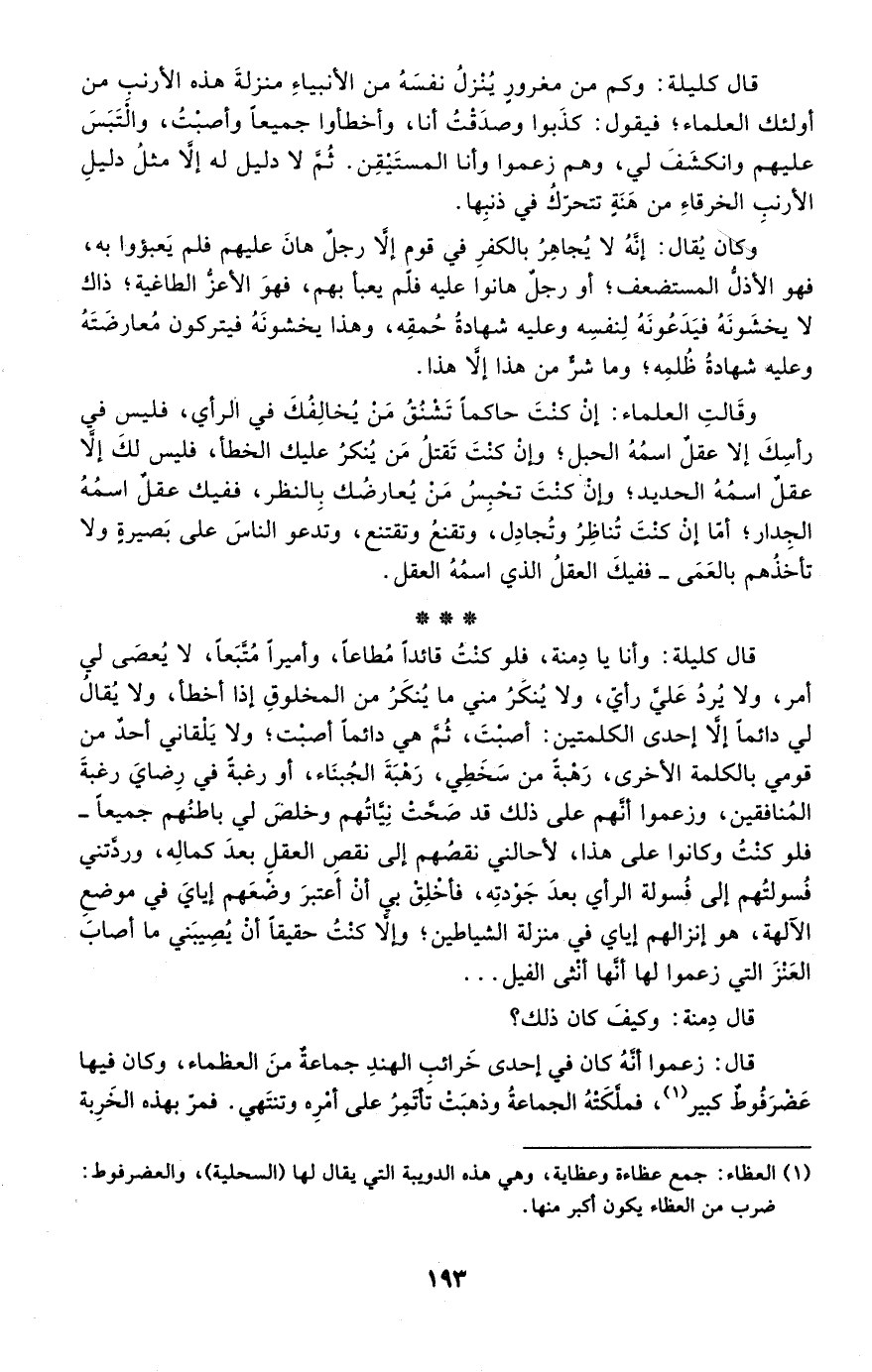 قال كليلة: وكم من مغرور ينزل نفسه من الأنبياء منزلة هذه الأرنب من أولئك العلماء؛ فيقول: كذبوا وصدقت أنا، وأخطئوا حميعًا وأصبت، والتبس عليهم وانكشف لي، وهم زعموا وأنا المستيقن. ثم لا دليل له إلا مثل دليل الأرنب الخرقاء من هنة تتحرك في ذنبها.