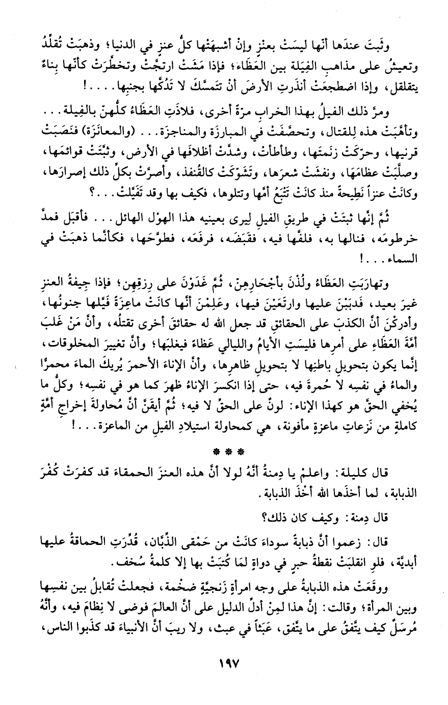 ومر ذلك الفيل بهذا الخراب مرة أخرى، فلاذت العظاء كلهن بالفيلة.. وتأهبت هذه للقتال، وتحصفت في المبارزة والمناجزة ... "والمعانزة" فنصبت قرنيها، وحركت زنمتها، وطأطأت، وشدت أظلافها في الأرض، وثبتت قوائمها، وصلبت عظامها، ونفشت شعرها، وتشوكت كالقنفذ، وأصرت بكل ذلك إصرارها، وكانت عنزا نطيحة منذ كانت تتبع أمها وتتلوها، فكيف بها وقد تفيلت؟