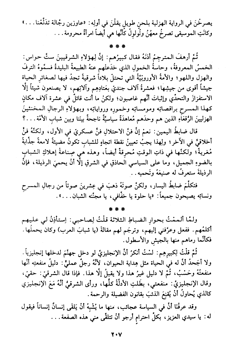 ثم أرهف المترجم أذنه فقال كبيرهم: إن لهؤلاء الشرقيين ست حواس: الخمس المعروفة، وحاسة الخمول الذي خدعتهم عنه الطبيعة البليدة فسموه الترف والهزل واللهو؛ والأمة الأوروبية التي تحتل بلاد شرقية تجد فيها لصغائر الحياة جيشا أقوى من جيشها؛ فعشرة آلاف جندي بعتادهم وآلاتهم، لا يصنعون شيئلا إلا الاستفزاز والتحدي وإثبات أنهم غاصبون؛ ولكن ما أنت قائل في عشرة آلاف مكان كهذا المسرح براقصاته ومومساته وخموره ورواياته، وبهؤلاء الرجال المخنثين الهزليين الرقعاء الذين هم وحدهم معاهدة سياسية ناجحة بيننا وبين شباب الأمة؟