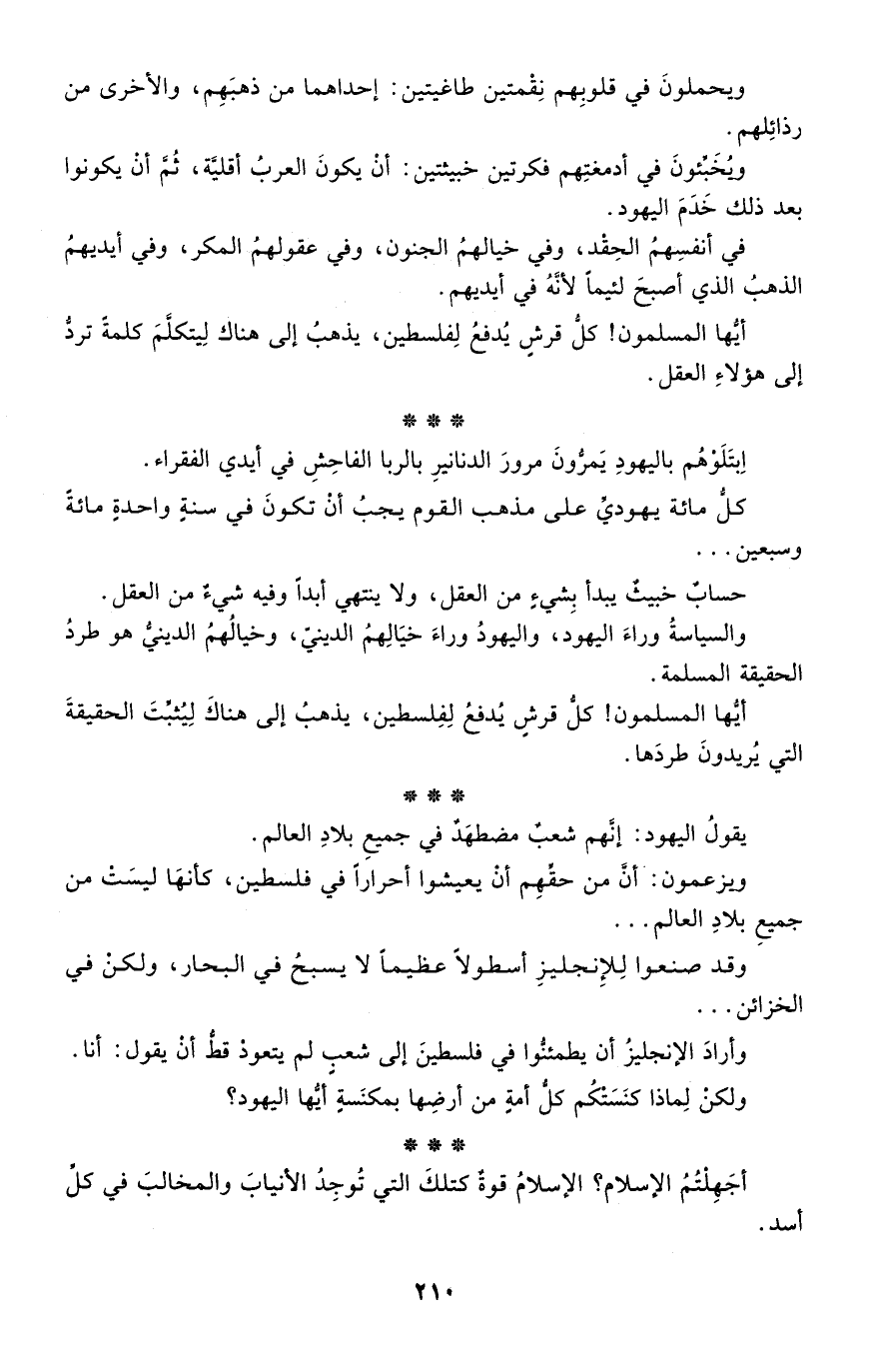 أيها المسلمون! كل قرش يدفع لفلسطين، يذهب إلى هناك ليتكلم كلمة ترد إلى هؤلاء العقل.