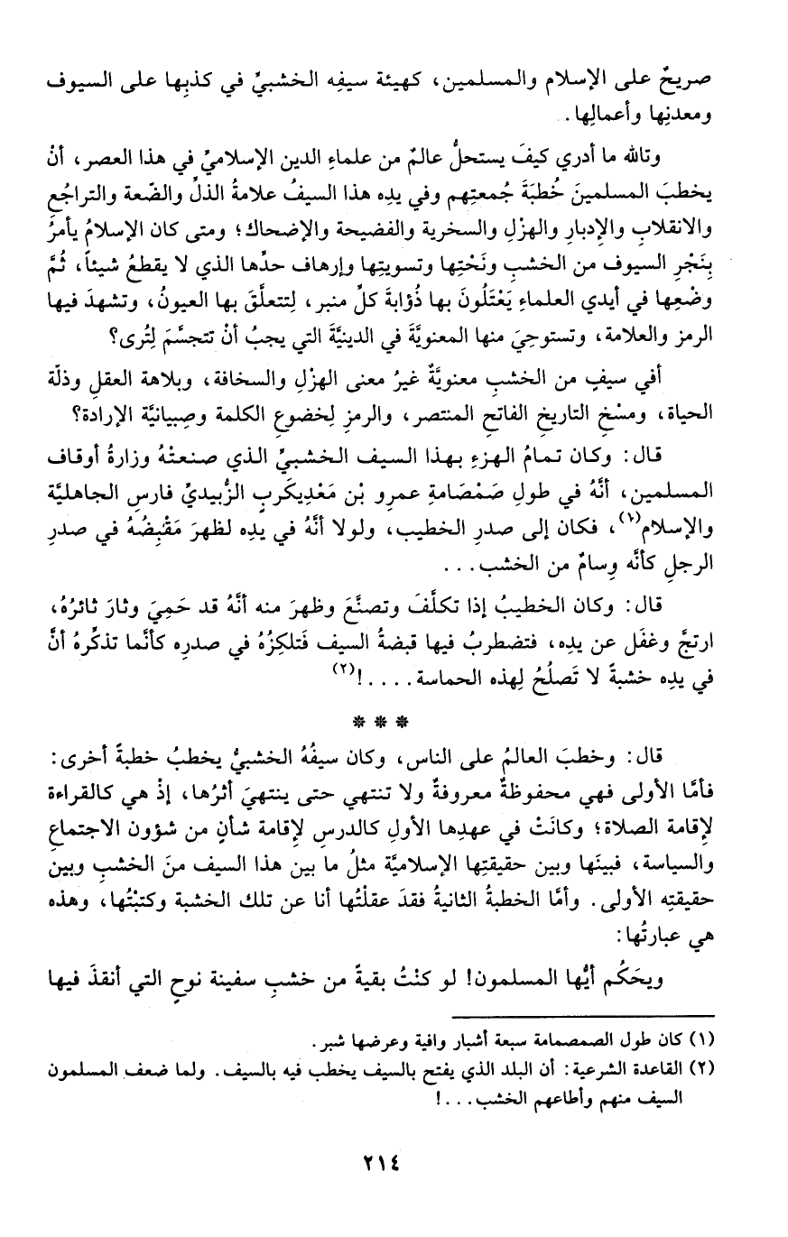 وتالله ما أدري كيف يستحل عالم من علماء الدين الإسلامي في هذا العصر، أن يخطب المسلمين خطبة جمعتهم وفي يده في هذا السيف علامة الذل والضعة والتراجع والانقلاب والإدبار والهزل والسخرية والفضيحة والإضحاك؛ ومتى كان الإسلام يأمر بنجر السيوف من الخشب ونحتها وتسويتها وإرهاف حدها الذي لا يقطع شيئا، ثم وضعها في أيدي العلماء يعتلون بها ذؤابة كل منبر، لتتعلق بها العيون، وتشهد فيها الرمز والعلامة، وتستوحي منها المعنوية في الدينية التي يجب أن تتجسم لترى؟