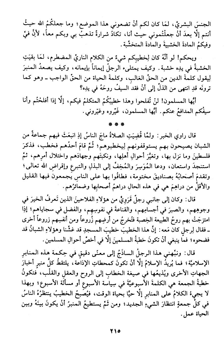 ويحكم! لو أنه كان لخطيبكم شيء من الكلام الناري المضطرم، لما بقيت الخشبة في يده خشبة، وكيف يمتلئ الرجل إيمانًا بإيمانه، وكيف يصعد المنبر ليقول كلمة الدين من الحق الغالب، وكلمة الحياة من الحق الواجب, وهو كما ترونه قد انتهى من الذل إلى أن فقد السيف روحه في يده؟