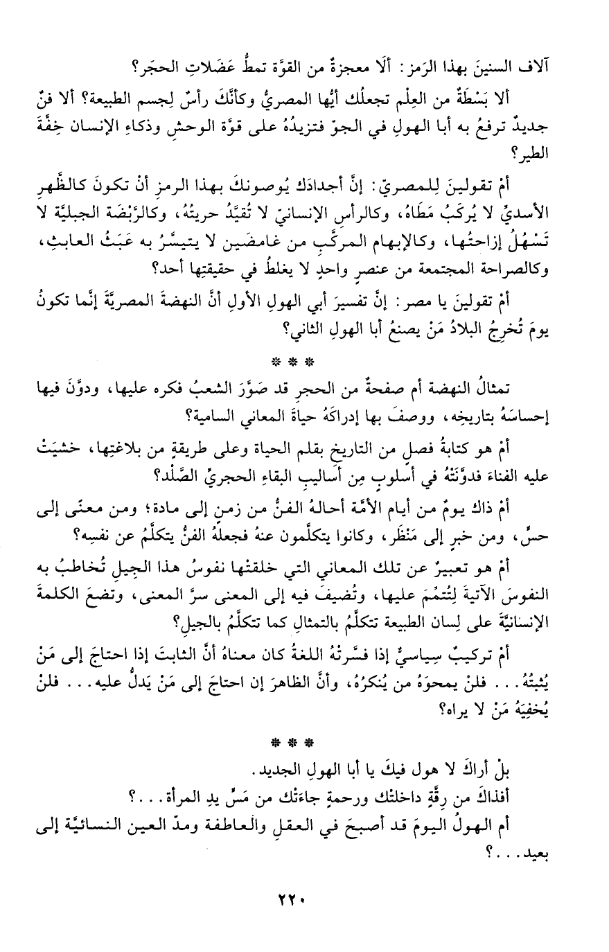 أم تقولين يا مصر: إن تفسير أبي الهول الأول أن النهضة المصرية إنما تكون يوم تخرج البلاد من يصنع أبا الهول الثاني؟