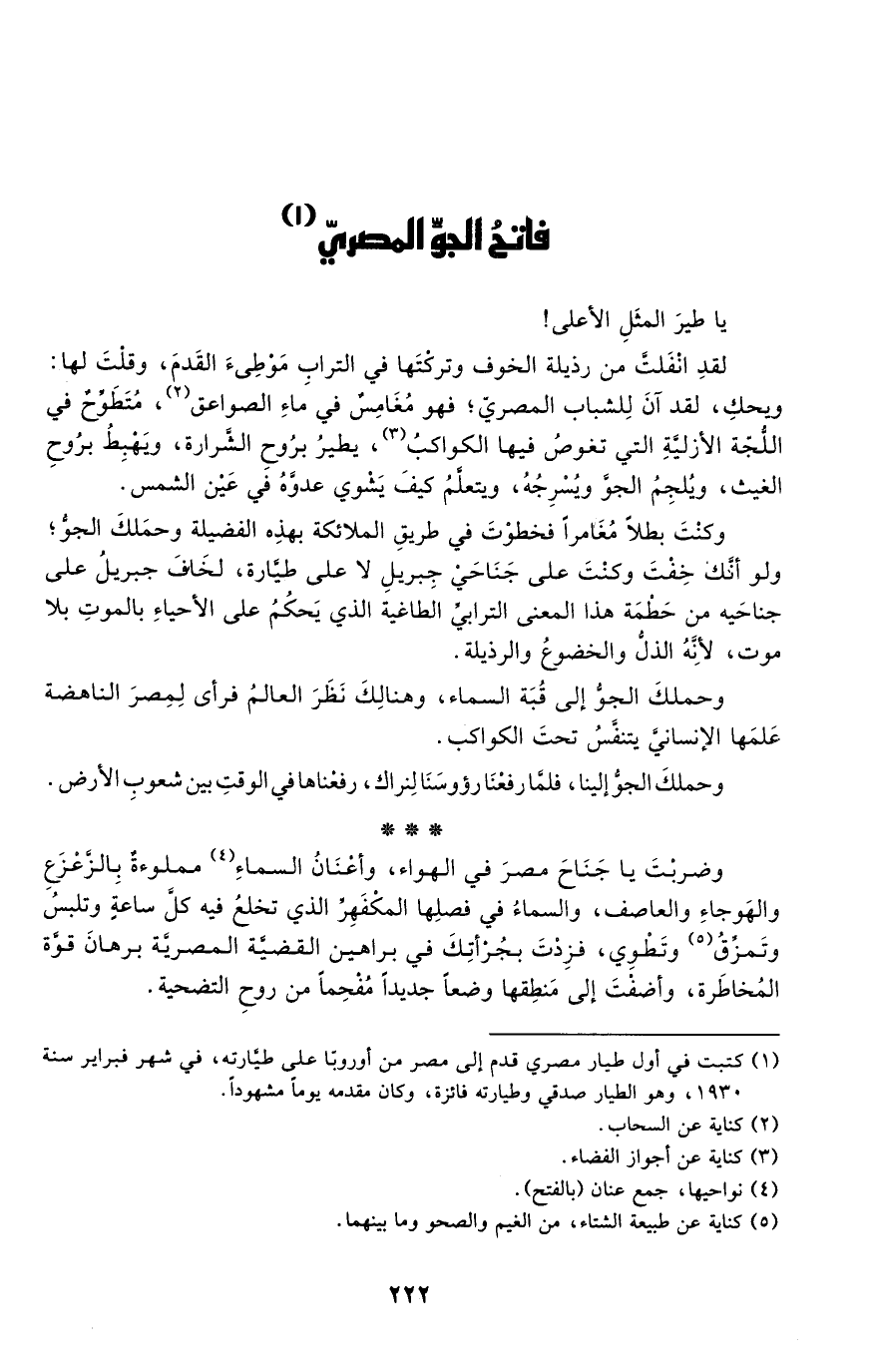 وحملك الجو إلى قبة السماء، وهنالك نظر العالم فرأى لمصر الناهضة علمها الإنساني يتنفس تحت الكواكب.