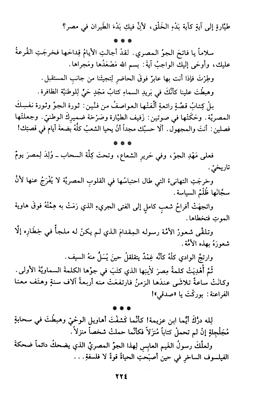 بل كتاب قصة رائعة ألفتها العواصف من فنين: ثورة الجو وثورة نفسك المصرية. وحكتها في صوتين: زفيف الطيارة وصرخة ضميرك الوطني. وجعلتها فصلين: أنت والمجهول. ألا حسبك مجدًا أن يحيا الشعب كله بضعة أيام في قصتك!