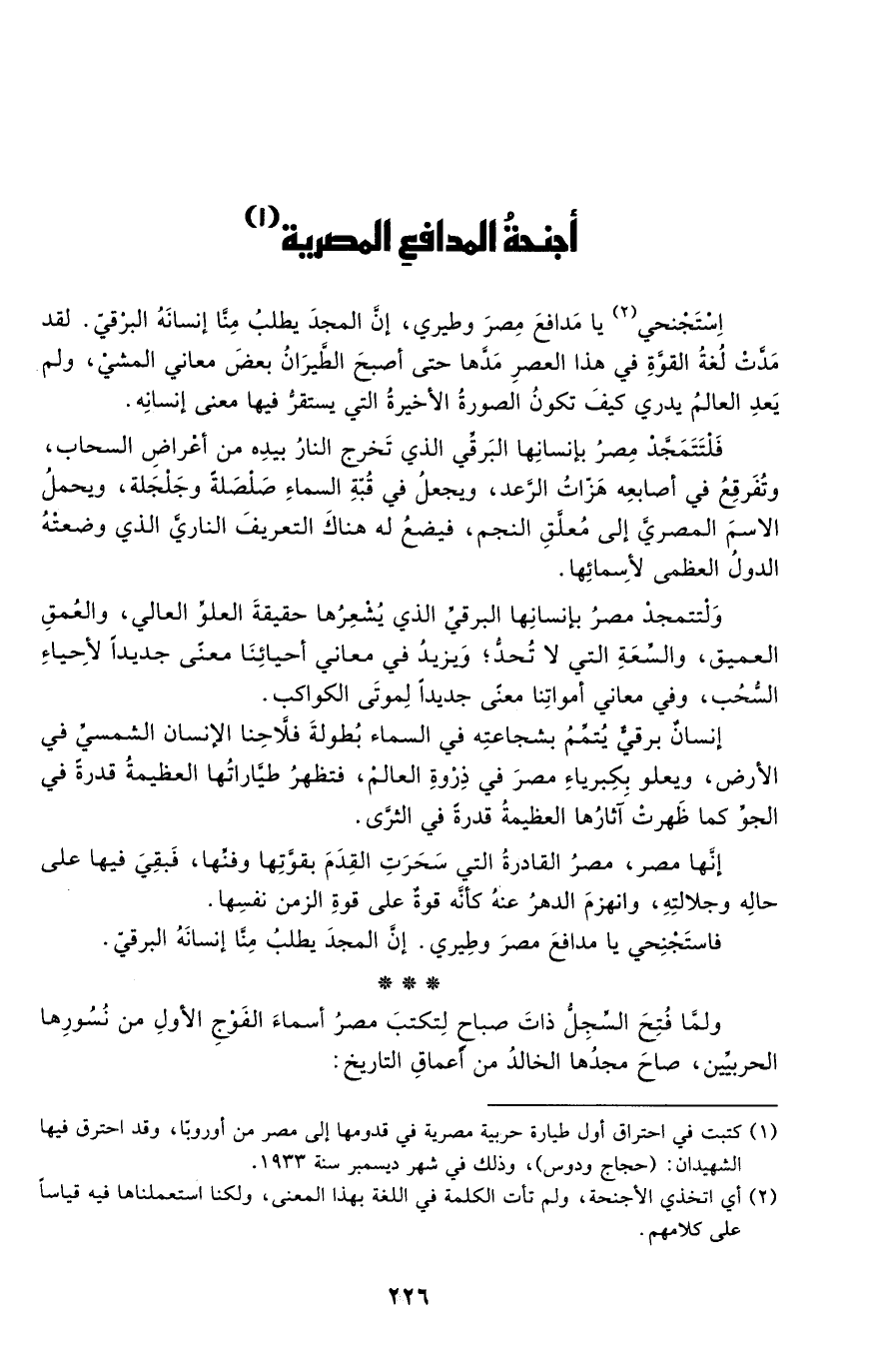 استجنحي2 يا مدافع مصر وطيري، إن المجد يطلب منا إنسانه البرقي. لقد مدت لغة القوة في هذا العصر مدها حتى أصبح الطيران بعض معاني المشي، ولم يعد العالم يدري كيف تكون الصورة الأخيرة التي يستقر فيها معنى إنسانه.