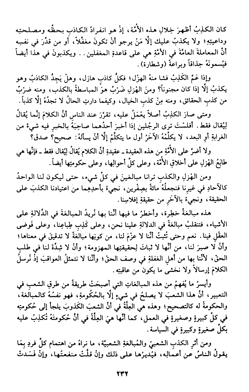 كان الكذب أظهر خلال هذه الأمة، إذ هو انفراد الكاذب بحظه ومصلحته وداعيته؛ ولا يكذب عليك إلا من يرجو أن تكون مغفلا، أو من قدر في نفسه أن المعاملة العامة في الأمة هي على قاعدة المغفلين ... ويكذبون في هذا أيضا فيسمونه حذاقا وبراعة "وشطارة".
