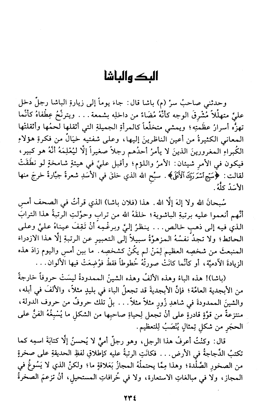 "باشا"! هذه الباء وهذه الألف وهذه الشين الممدودة ليست حروفا خارجة من الأبجدية العامة؛ فإن الأبجدية قد تجعل الباء في بليد مثلا، والألف في أبله، والشين الممدودة في شاهد زور مثلا مثلا ... بل تلك حروف من حروف الدولة، منتزعة من قوة قادرة على أن تجعل لحياة صاحبها من الشكل ما يسبغه الفن على الحجر من شكل تمثال ينصب للتعظيم.