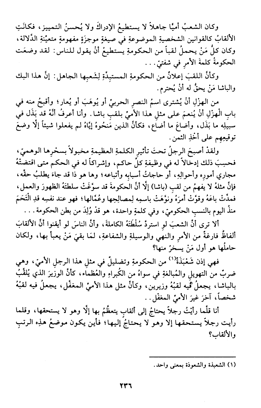 ألا ترى أن الشعب لو استرد سلطته الكاملة، وأن الناس لو أيقنوا أن الألقاب ألفاظ فارغة من الأمر والنهي والوسيلة والشفاعة، لما بقي من يعبأ بها، ولكان حاملها هو أول من يسخر منها؟
