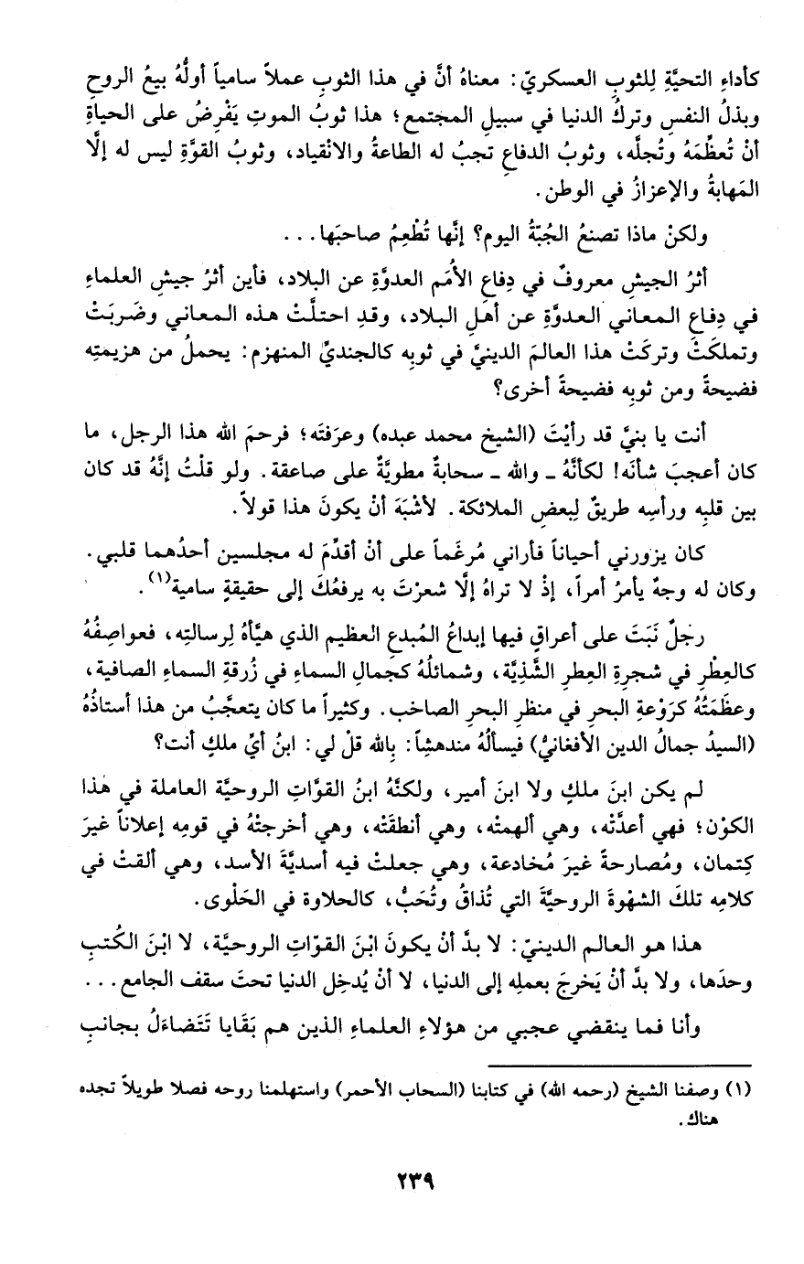 أثر الجيش معروف في دفاع الأمم العدوة عن البلاد، فأين أثر جيش العلماء في دفاع المعاني العدوة عن أهل البلاد، وقد احتلت هذه المعاني وضربت وتملكت وتركت هذا العالم الديني في ثوبه كالجندي المنهزم؛ يحمل من هزيمته فضيحة ومن ثوبه فضيحة أخرى؟