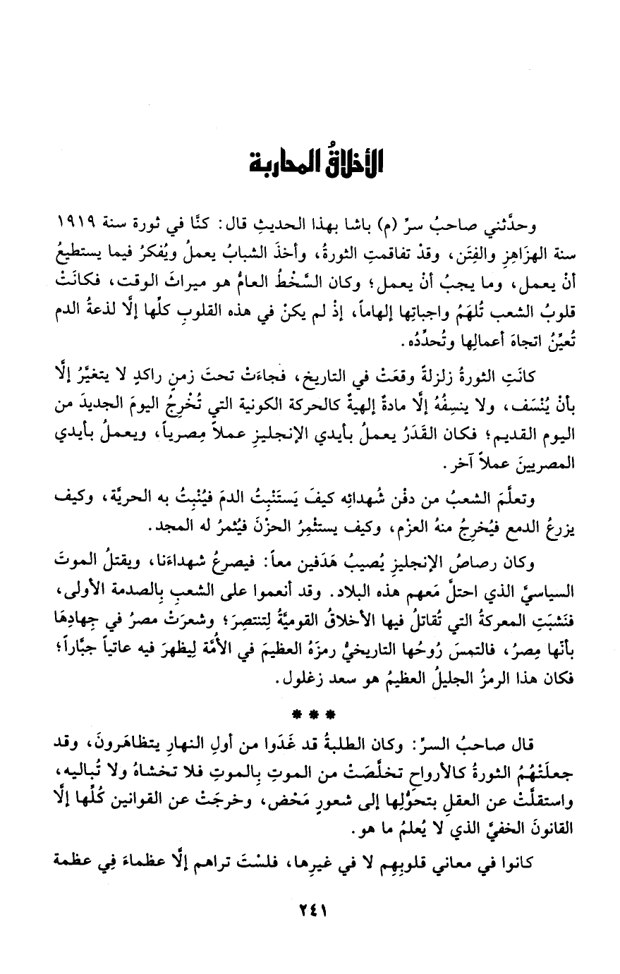 وكان رصاص الإنجليز يصيب هدفين معا: فيصرع شهداءنا، ويقتل الموت السياسي الذي احتل معهم هذه البلاد. وقد أنعموا على الشعب بالصدمة الأولى، فنشبت المعركة التي تقاتل فيها الأخلاق القومية لتنتصر؛ وشعرت مصر في جهادها بأنها مصر، فالتمس روحها التاريخي رمزه العظيم في الأمة ليظهر فيه عاتيا جبارًا؛ فكان هذا الرمز الجليل العظيم هو سعد زغلول.