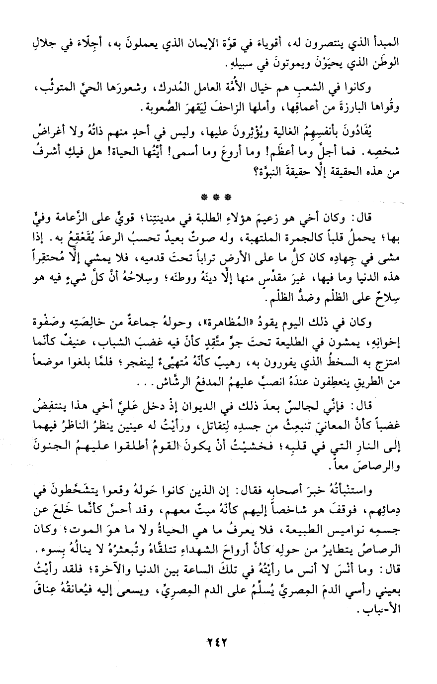 وكان في ذلك اليوم يقود "المظاهرة"، وحوله جماعة من خالصته وصفوة إخوانه، يمشون في الطليعة تحت جو متقد كأن فيه غضب الشباب، عنيف كأنما امتزج به السخط الذي يفورون به، رهيب كأنه متهيء لينفجر؛ فلما بلغوا موضعا من الطريق ينعطفون عنده انصب عليه المدفع الرشاش ...
