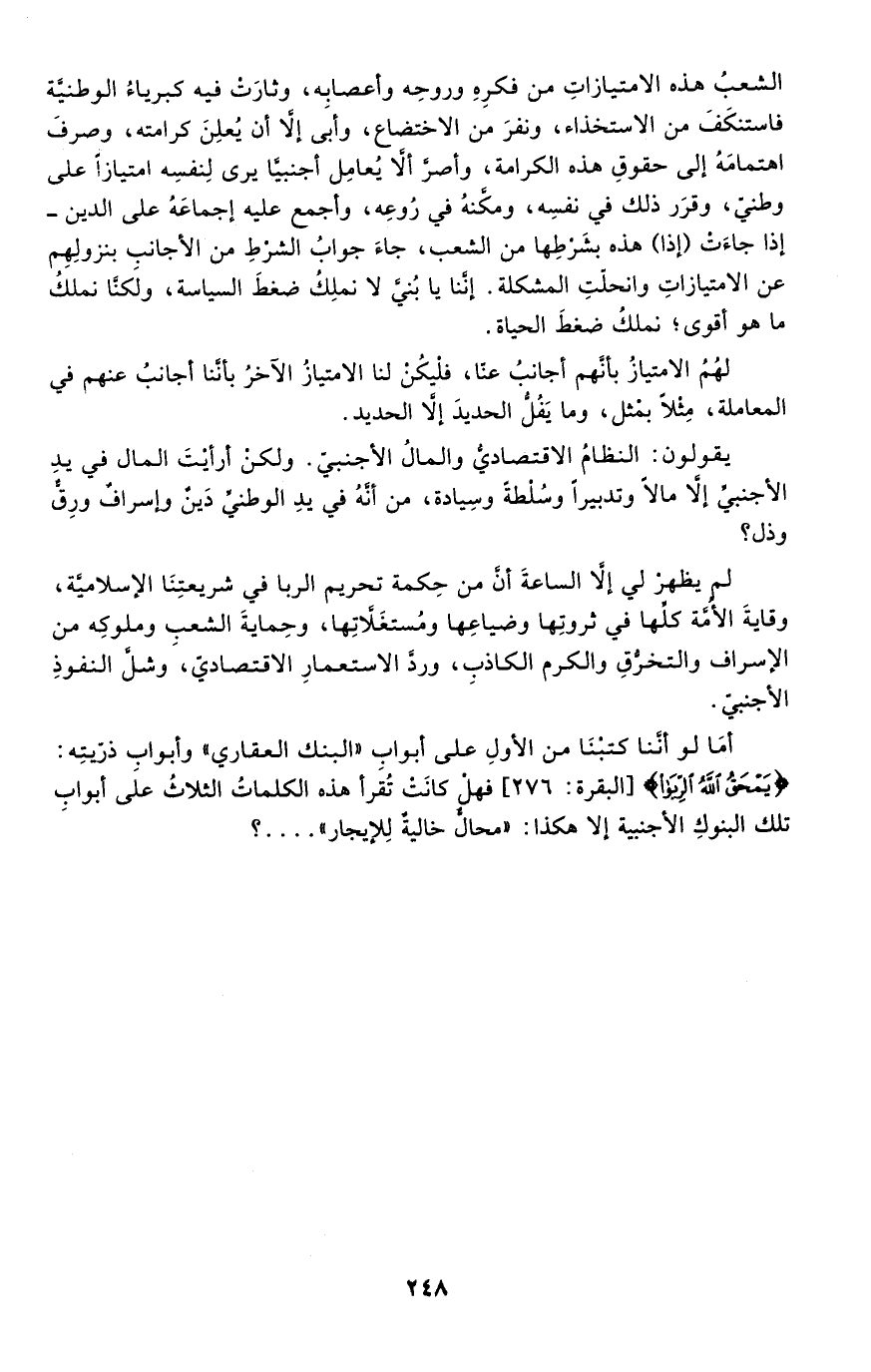 يقولون: النظام الاقتصادي والمال الأجنبي. ولكن أرأيت المال في يد الأجنبي إلا مالًا وتدبيرًا وسلطة وسيادة، من أنه في يد الوطني دين وإسراف ورق وذل؟