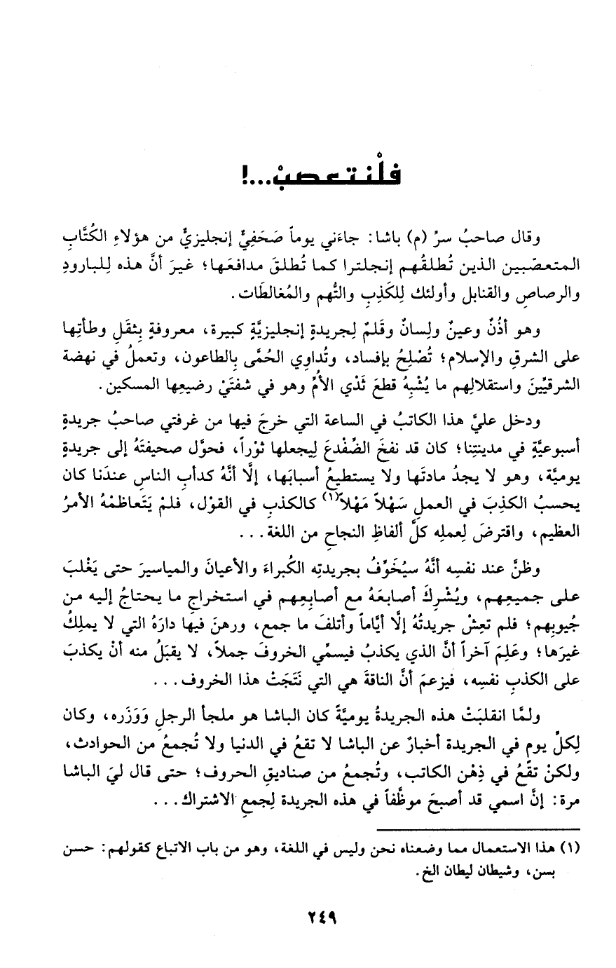 وهو أذن وعين ولسان وقلم لجريدة إنجليزية كبيرة، معروفة بثقل وطأتها على الشرق والإسلام؛ وتصلح بإفساد، وتداوي الحمى بالطاعون، وتعمل في نهضة الشرقيين واستقلالهم ما يشبه قطع ثدي الأم وهو في شفتي رضيعها المسكين.
