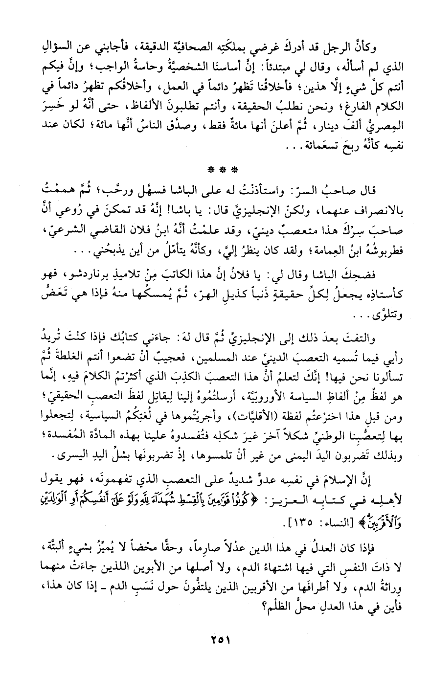 إن الإسلام في نفسه عدو شديد على التعصب الذي تفهمونه، فهو يقول لأهله في كتابه العزيز: {كُونُوا قَوَّامِينَ بِالْقِسْطِ شُهَدَاءَ لِلَّهِ وَلَوْ عَلَى أَنْفُسِكُمْ أَوِ الْوَالِدَيْنِ وَالْأَقْرَبِينَ} [النساء: 135] .
