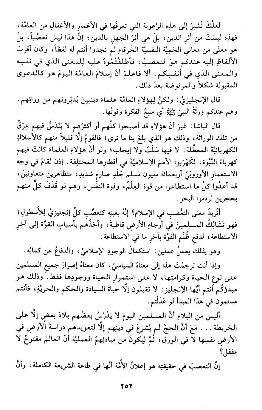 أتريد معنى التعصب في الإسلام؟ إنه بعينه كتعصب كل إنجليزي للأسطول؛ فهو تشابك المسلمين في أرجاء الأرض قاطبة، وأخذهم بأسباب القوة إلى آخر الاستطاعة، لدفع ظلم القوة بآخر ما في الاستطاعة.