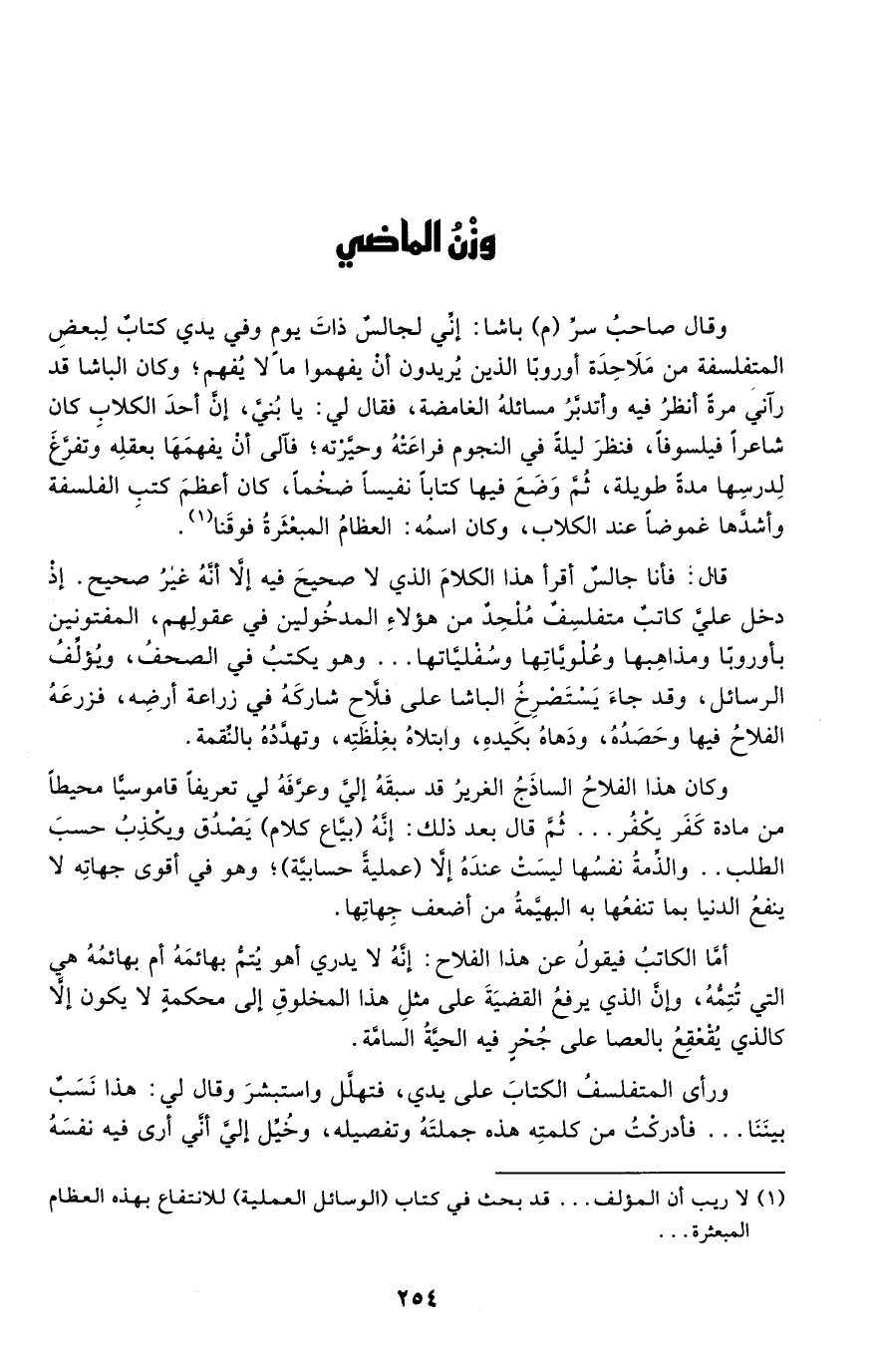 وكان هذا الفلاح الساذج الغرير قد سبقه إلي وعرفه لي تعريفا قاموسيا محيطا من مادة كفر يكفر ... ثم قال بعد ذلك: إنه "بياع كلام" يصدق ويكذب حسب الطلب ... والذمة نفسها ليست عنده إلا "عملية حسابية"؛ وهو في أقوى جهاته لا ينفع الدنيا بما تنفعها به البهيمة من أضعف جهاتها.