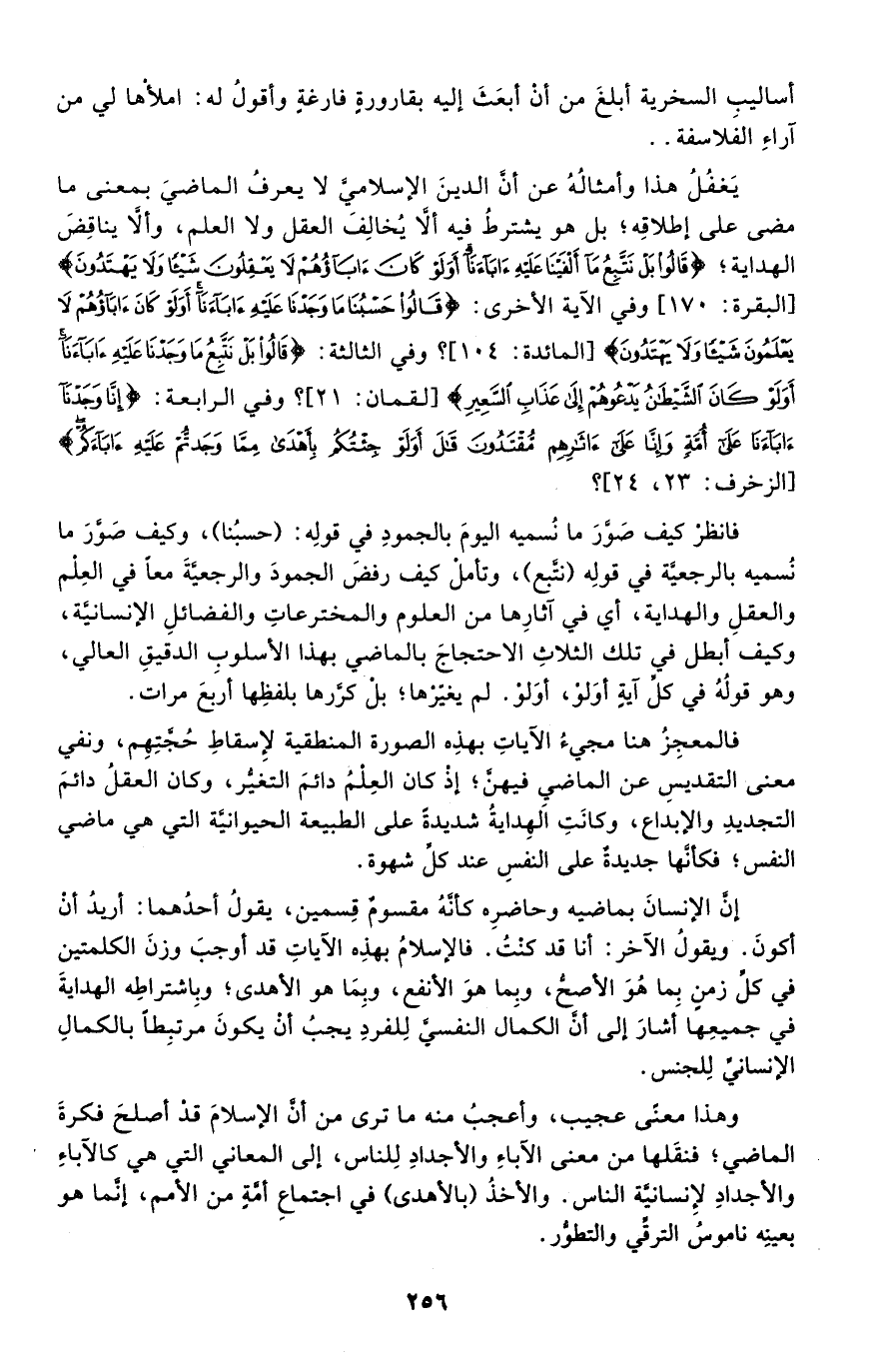 يغفل هذا وأمثاله عن أن الدين الإسلامي لا يعرف الماضي بمعنى ما مضى على إطلاقه؛ بل هو يشترط فيه ألا يخالف العقل ولا العلم، وألا يناقض الهداية؛ {قَالُوا بَلْ نَتَّبِعُ مَا أَلْفَيْنَا عَلَيْهِ آبَاءَنَا أَوَلَوْ كَانَ آبَاؤُهُمْ لا يَعْقِلُونَ شَيْئًا وَلا يَهْتَدُونَ} [البقرة: 170] , وفي الآية الأخرى: {قَالُوا حَسْبُنَا مَا وَجَدْنَا عَلَيْهِ آبَاءَنَا أَوَلَوْ كَانَ آبَاؤُهُمْ لا يَعْلَمُونَ شَيْئًا وَلا يَهْتَدُونَ} [المائدة: 104] , {قَالُوا بَلْ نَتَّبِعُ مَا وَجَدْنَا عَلَيْهِ آبَاءَنَا أَوَلَوْ كَانَ الشَّيْطَانُ يَدْعُوهُمْ إِلَى عَذَابِ السَّعِيرِ} [لقمان: 21] , وفي الرابعة: {إِنَّا وَجَدْنَا آبَاءَنَا عَلَى أُمَّةٍ وَإِنَّا عَلَى آثَارِهِمْ مُقْتَدُونَ، قَالَ أَوَلَوْ جِئْتُكُمْ بِأَهْدَى مِمَّا وَجَدْتُمْ عَلَيْهِ آبَاءَكُمْ} [الزخرف: 23، 24] .