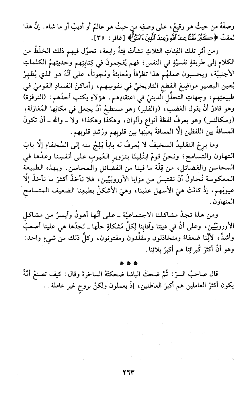 وما برح التقليد السخيف لا يعرف له بابا يلج منه إلى السخفاء إلا باب التهاون والتسامح؛ ونحن قوم ابتلينا بتزوير العيوب على أنفسنا وعدها في المحاسن والفضائل، من قلة ما فينا من الفضائل والمحاسن، وبهذه الطبيعة المعكوسة نحاول أن نقتبس من مزايا الأوروبيين، فلا نأخذ أكثر ما نأخذ إلا عيوبهم، إذ كانت هي الأسهل علينا، وهي الأشكل بطبعنا الضعيف المتسامح المتهاون.