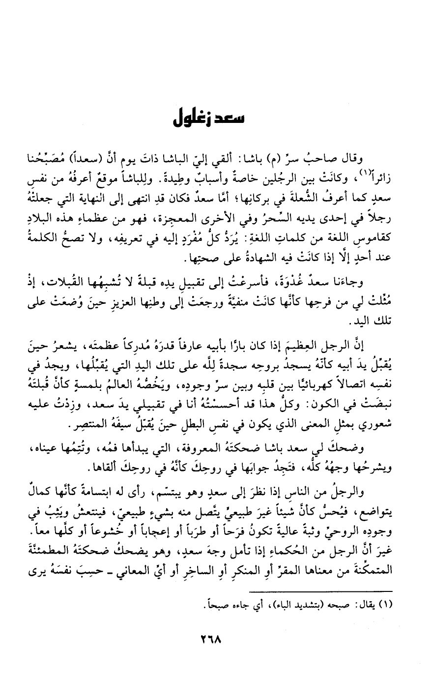 والرجل من الناس إذا نظر إلى سعد وهو يبتسم، رأى له ابتسامة كأنها كمال يتواضع، فيحس كأن شيئا غير طبيعي يتصل منه بشيء طبيعي، فينتعش ويثب في وجوده الروحي وثبة عالية تكون فرحًا أو طربًا أو إعجابًا أو خشوعًا أو كلها معا.
