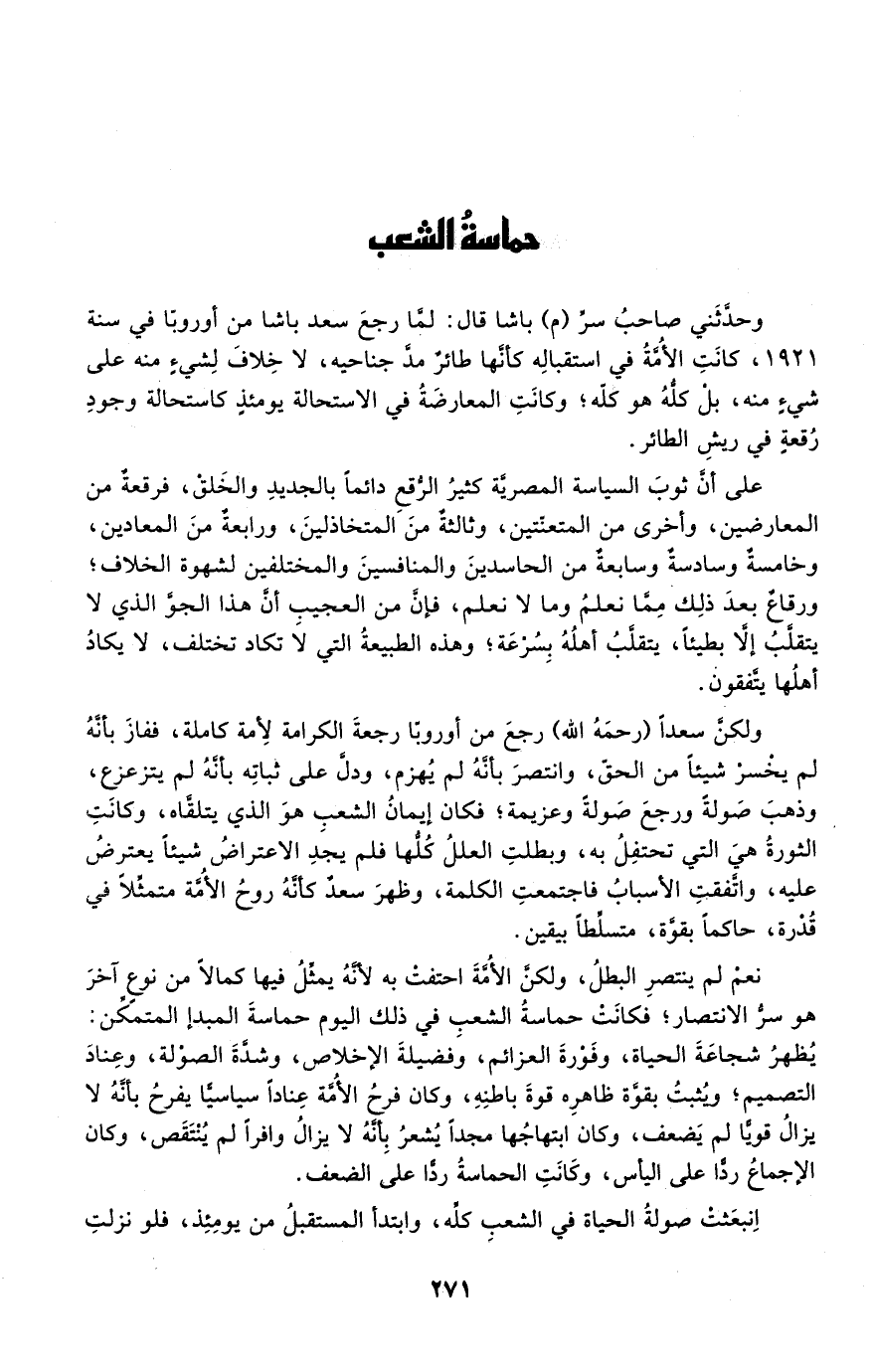 وحدثني سر "م" باشا قال: لما رجع سعد باشا من أوروبا في سنة 1921، كانت الأمة في استقباله كأنها طائر مد جناحيه، لا خلاف لشيء منه على شيء منه، بل كله هو كله؛ وكانت المعارضة في الاستحالة يومئذ كاستحالة وجود رقعة في ريش الطائر.