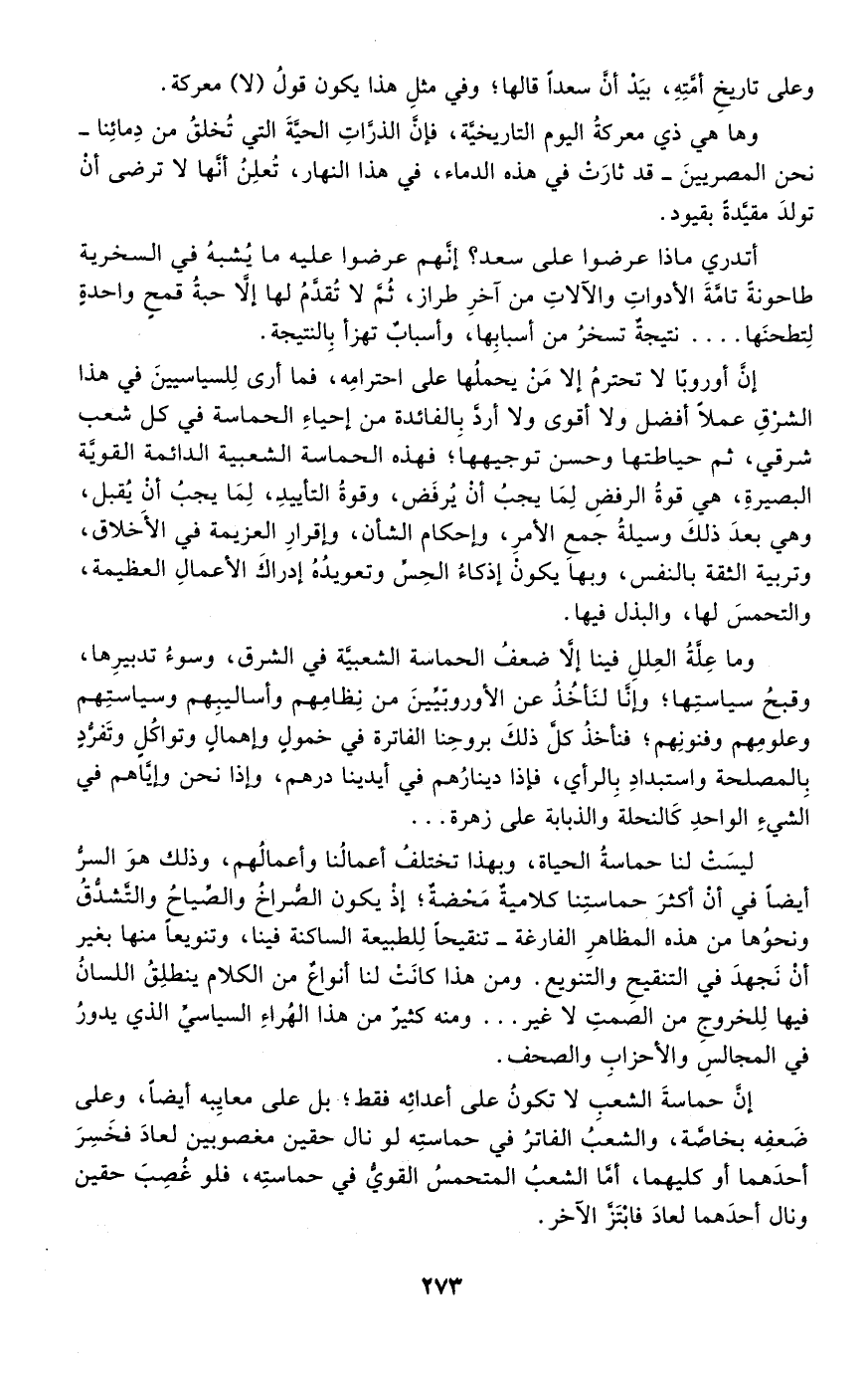 إن أوروبا لا تحترم لا من يحملها على احترامه، فما أرى للسياسيين في هذا الشرق عملا أفضل ولا أقوى ولا أرد بالفائدة من إحياء الحماسة في كل شعب شرقي، ثم حياطتها وحسن توجيهها؛ فهذه الحماسة الشعبية الدائمة القوية البصيرة، هي قوة الرفض لما يجب أن يرفض، وقوة التأييد، لما يجب أن يقبل، وهي بعد ذلك وسيلة جمع الأمر، وإحكام الشأن، وإقرار العزيمة في الأخلاق، وتربية الثقة بالنفس، وبها يكون إذكاء الحس وتعويده إدراك الأعمال العظيمة، والتحمس لها، والبذل فيها.