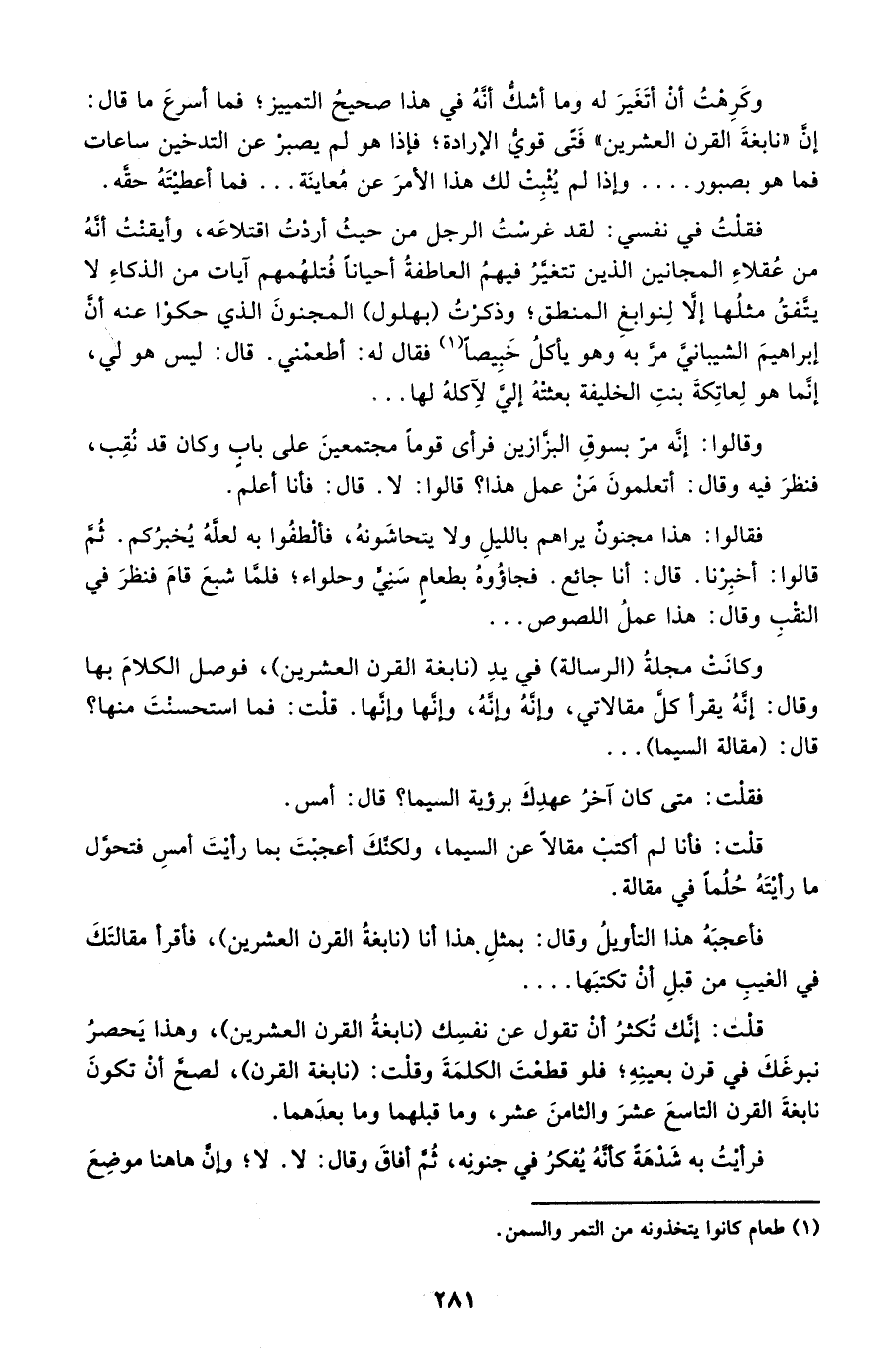 فقلت في نفسي: لقد غرست الرجل من حيث أردت اقتلاعه، وأيقنت أنه من عقلاء المجانين الذين تتغير فيهم العاطفة أحيانا فتلهمهم آيات من الذكاء لا يتفق مثلها إلا لنوابغ المنطق؛ وذكرت "بهلول" المجنون الذي حكوا عنه أن إبراهيم الشيباني مر به وهو يأكل خبيصًا1 فقال له: أطعمني. قال: ليس هو لي، إنما هو لعاتكة بنت الخليفة بعثته إلي لآكله لها ...