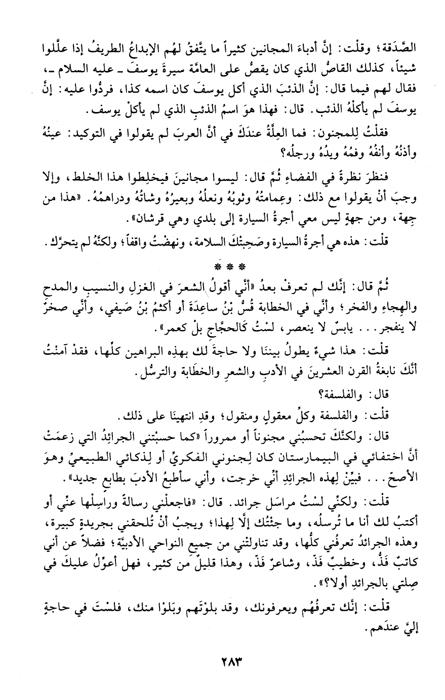 الصدقة؛ وقلت: إن أدباء المجانين كثيرًا ما يتفق لهم الإبداع الطريف إذا عللوا شيئا، كذلك القاص الذي كان يقص على العامة سيرة يوسف -عليه السلام- فقال لهم فيما قال: إن الذئب الذي أكل يوسف كان اسمه كذا، فردوا عليه: إن يوسف لم يأكله الذئب. قال: فهذا هو اسم الذئب الذي لم يأكل يوسف.