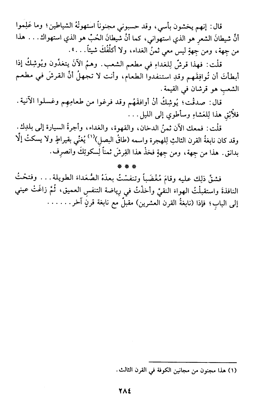 قلت: فمعك الآن ثمن الدخان، والقهوة، والغداء، وأجرة السيارة إلى بلدك. وقد كان نابغة القرن الثالث للهجرة واسمه "طاق البصل"1 يغني بقيراط ولا يسكت إلا بدانق. هذا من جهة، ومن جهة فخذ هذا القرش ثمنا لسكوتك وانصرف.