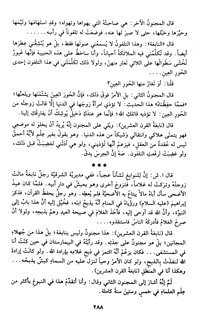 قال المجنون الآخر: هي صاحبته التي يهواها وتهواه؛ وقد استهامها وتيمها وحيرها وخبلها، حتى لا صبر لها عنه؛ فوضعت له تلفونا في رأسه ...