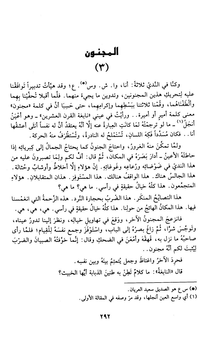 وكنا في الندي ثلاثة: أنا وا. ش, وس. ع*؛ وقد هيأت تدبيرا توافقنا عليه لتحريك هذين المجنونين، وتدوين ما يجيء منهما. فلما أقبلا تحفينا بهما وألطفناهما، وقمنا ثلاثتنا ببسطهما وإكرامهما، حتى حسبا أن في كلمة "مجنون" معنى كلمة أمير أو أميرة ... ورأيت في عيني "نابغة القرن العشرين" -وهو أعين أنجل1- ما لو ترجمته لما كانت العبارة عنه إلا أنه يعتقد أن له نفسا أنثى أعشقها أنا ... فكان مسددا فكه اللسان، تستملح له النادرة، وتستظرف منه الحركة.