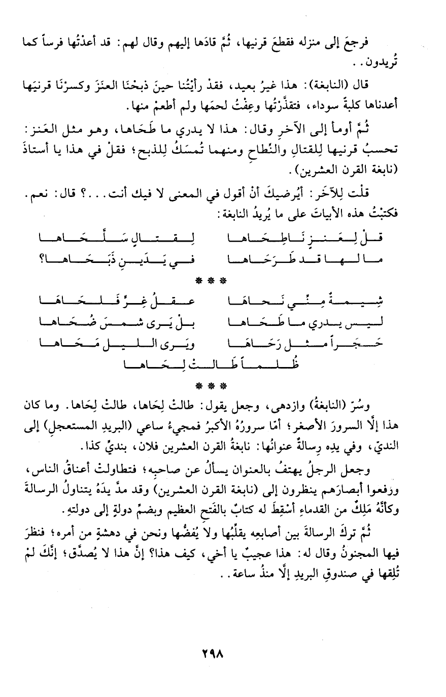 ثم أومأ إلى الآخر وقال: هذا لا يدري ما طحاها، وهو مثل العنز: تحسب قرنيها للقتال والنطاح ومنهما تمسك للذبح؛ فقل في هذا يا أستاذ "نابغة القرن العشرين".
