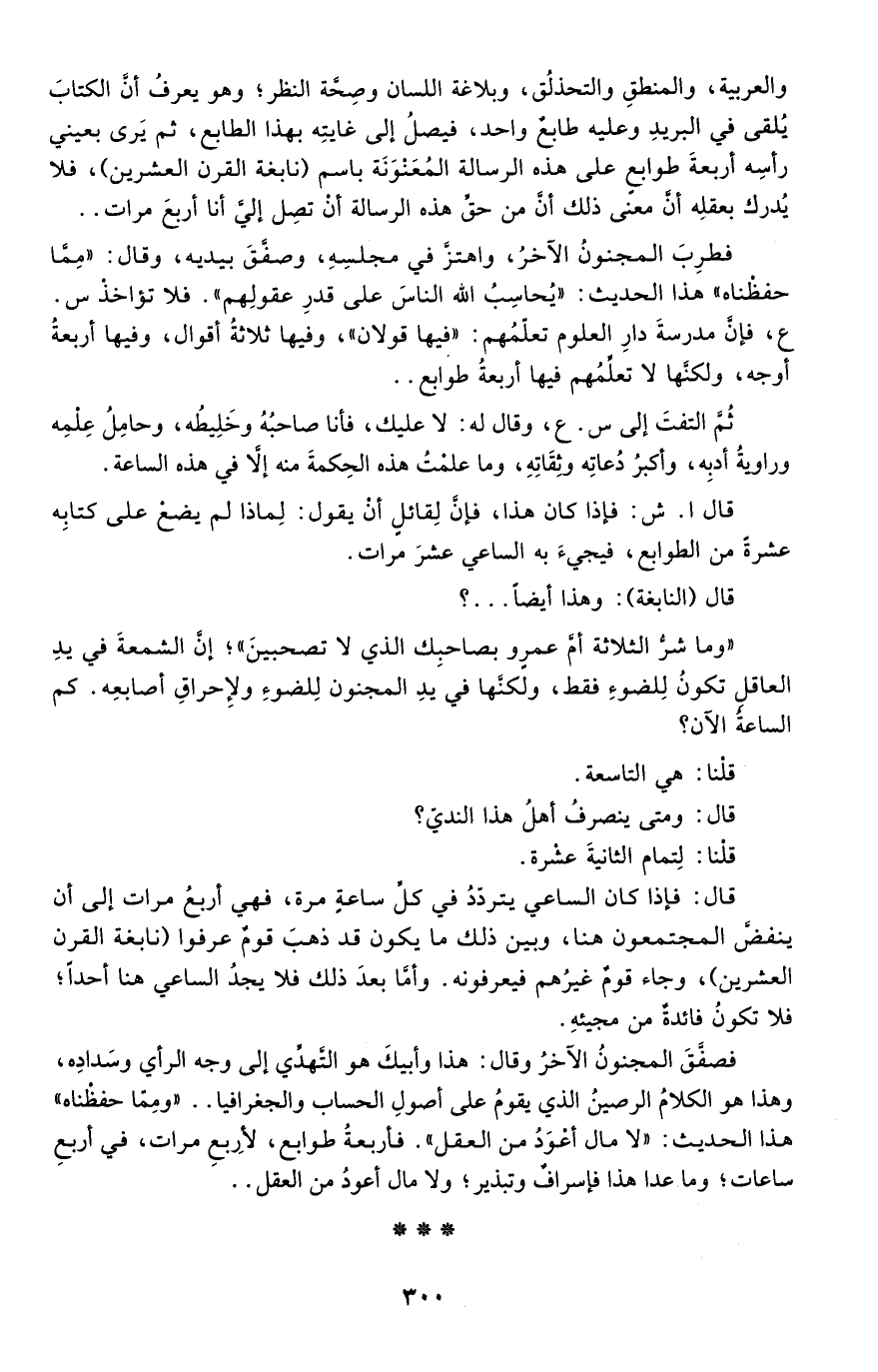 فصفق المجنون الآخر وقال: هذا وأبيك هو التهدي إلى وجه الرأي وسداده، وهذا هو الكلام الرصين الذي يقوم على أصول الحساب والجغرافيا ... "ومما حفظناه" هذا الحديث: "لا مال أعود من العقل". فأربعة طوابع، لأربع مرات، في أربع ساعات؛ وما عدا هذا فإسراف وتبذير؛ ولا مال أعود من العقل.