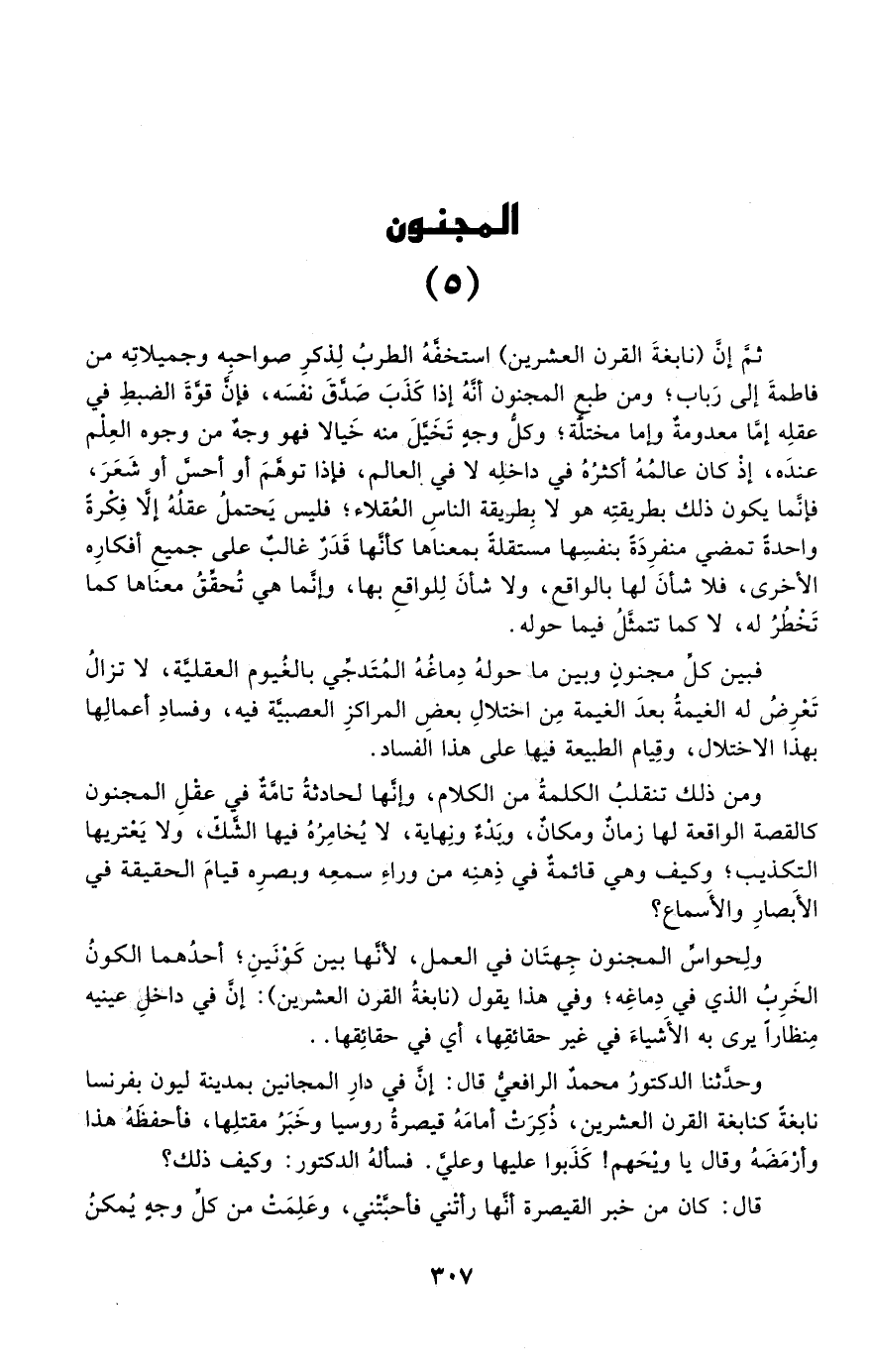 م إن "نابغة القرن العشرين" استخفه الطرب لذكر صواحبه وجميلاته من فاطمة إلى رباب؛ ومن طبع المجنون أنه إذا كذب صدق نفسه، فإن قوة الضبط في عقله إما معدومة وإما مختلة؛ وكل وجه تخيل منه خيالا فهو وجه من وجوه العلم عنده، إذ كان عالمه أكثره في داخله لا في العالم، فإذا توهم أو أحس أو شعر، فإنما يكون ذلك بطريقته هو لا بطريقة الناس العقلاء؛ فليس يحتمل عقله إلا فكرة واحدة تمضي